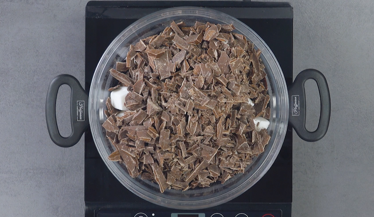 1. Hacke zunächst die Vollmilchkuvertüre klein und brich das Kokosfett in Stücke. Zerlasse beides bei milder Hitze in einem Topf. Danach lässt du alles abkühlen.