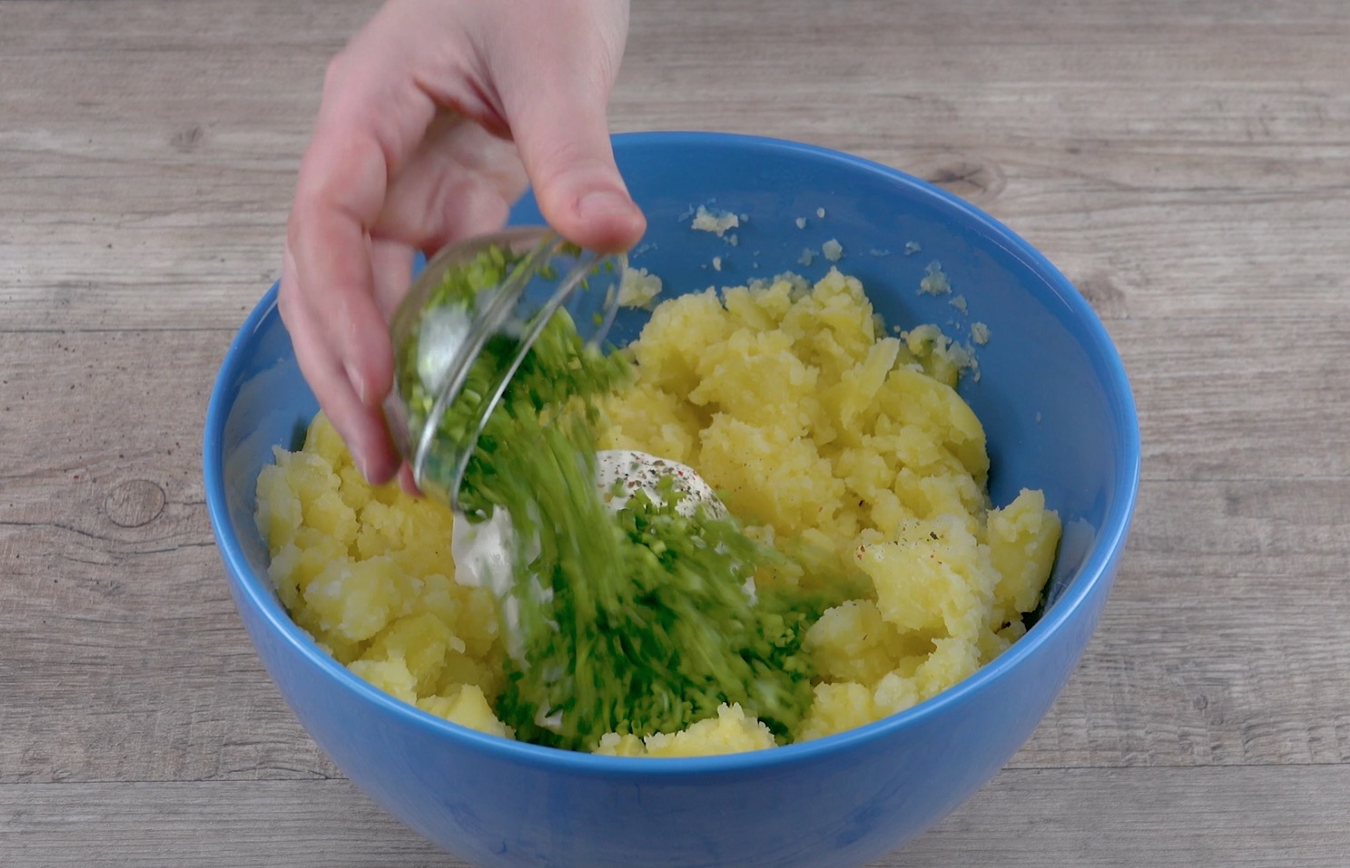 1. Gib für die Füllung des Rings die gekochten Kartoffeln zunächst in eine Schüssel und zerdrücke sie mit einer Gabel zu feinen Stückchen. Hebe dann die Crème fraîche, Salz und Pfeffer sowie den Schnittlauch, die Schalotte und den Schinken unter und vermische alles gründlich.