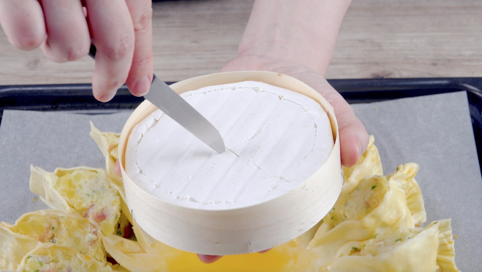 5. Streiche anschließend die gesamte Oberfläche mit Eigelb ein. Bevor du den Ofenkäse in die Mulde setzt, schneidest du einen Kreis und anschließend ein Kreuz hinein.
