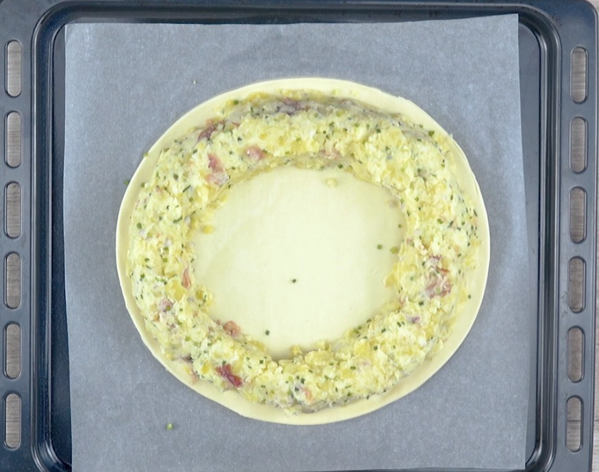 2. Nun legst du eine der Blätterteigplatten auf ein mit Backpapier ausgelegtes Backblech, verteilst das Kartoffelpüree ringförmig darauf und drückst es etwas fest. Lass außen einen Rand von ca. 1,5 cm und in der Mitte so viel Platz, dass später der Ofenkäse hineinpasst.