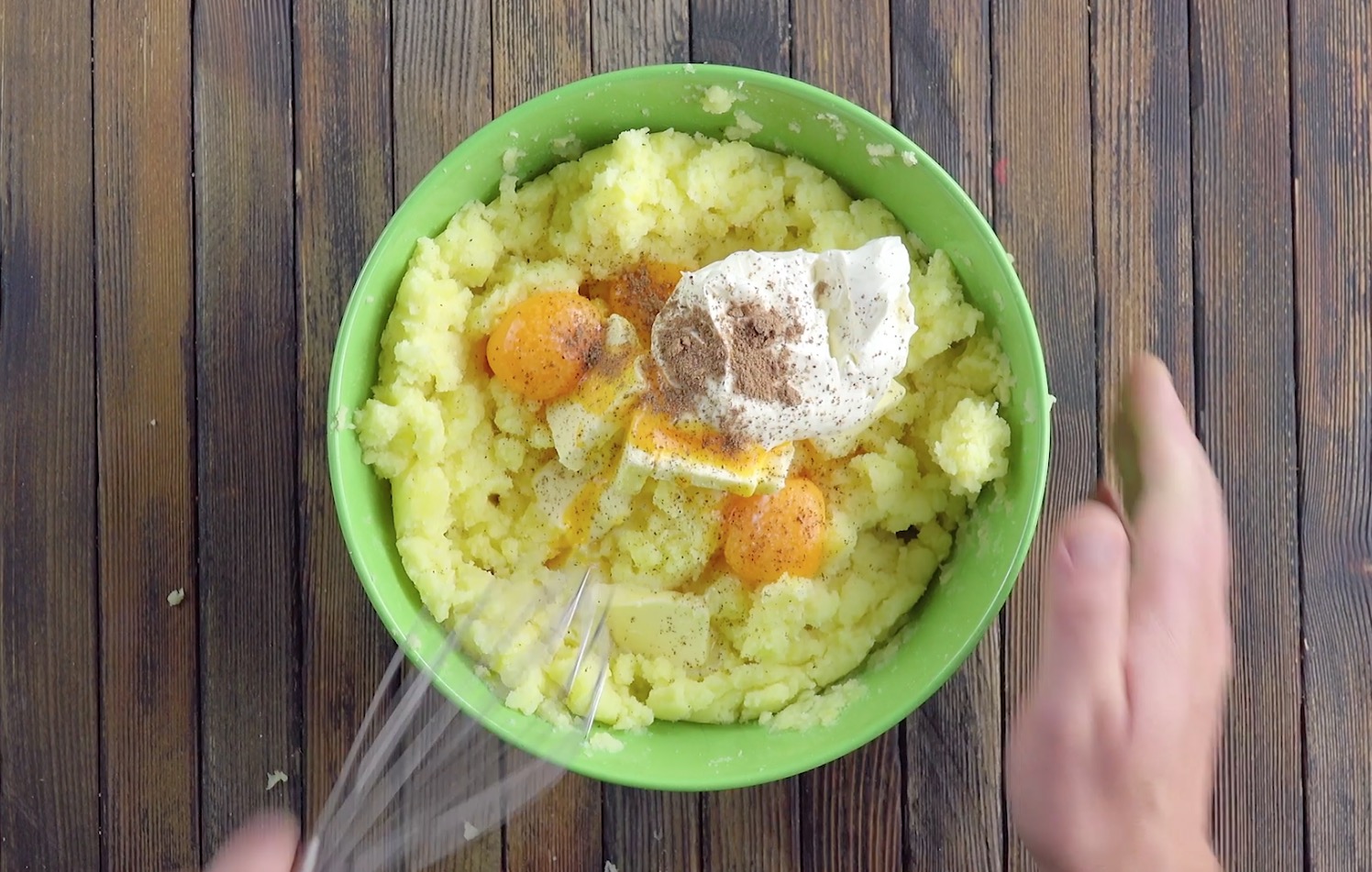 3.) Nun geht es an die Zubereitung des Kartoffelpürees: Verarbeite dafür die Kartoffeln mit einem Kartoffelstampfer zu Püree und gib dann die Butter, die Crème fraîche, die Eigelbe und die Gewürze hinzu. Verrühre alles sorgfältig mit einem Schneebesen.
