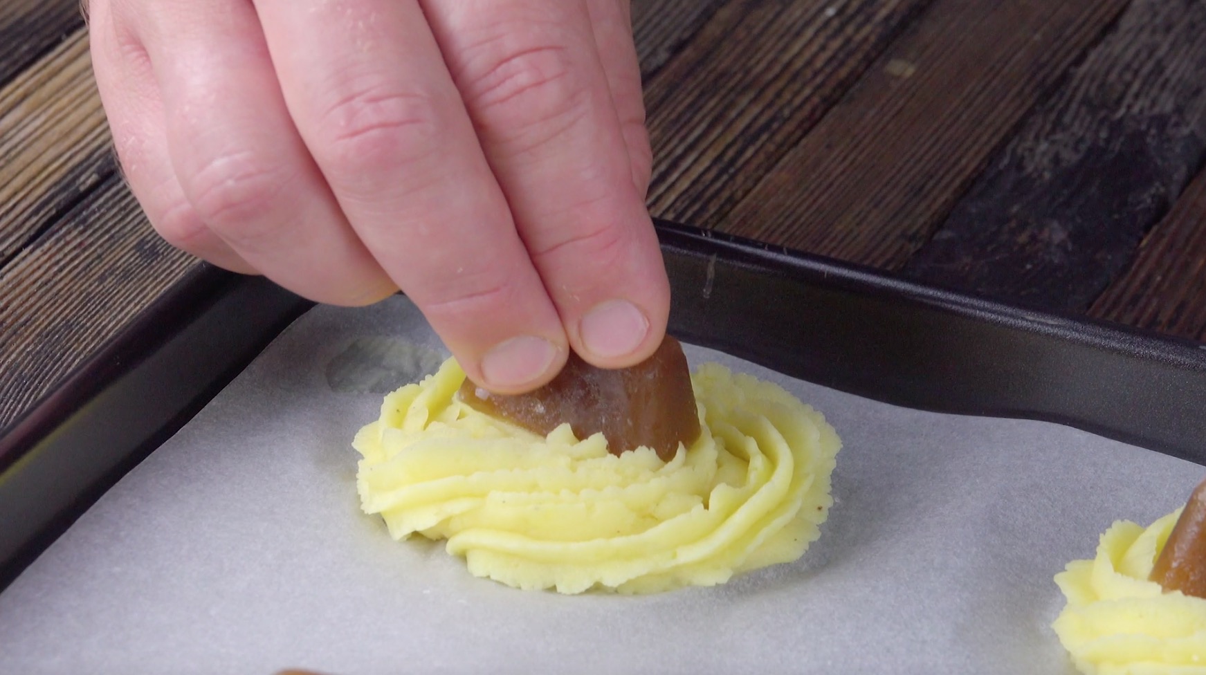 4.) Spritze einen Püreekreis auf ein mit Backpapier ausgelegtes Backblech. Darauf kommt ein Soßeneiswürfel. Spritze nun wiederum Kartoffelpüree darum herum und darauf, bis ein Türmchen entsteht.