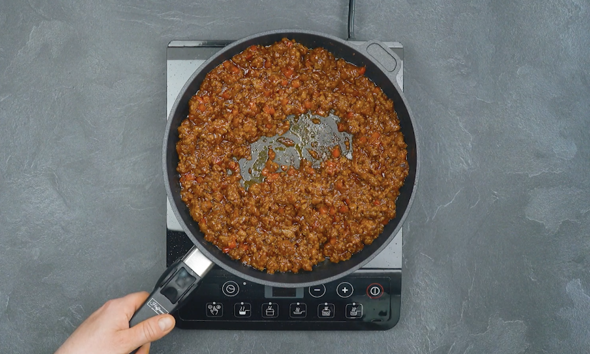 7. Brate Hackfleisch in Pflanzenöl an und gib Zwiebeln und Knoblauch hinzu. Röste alles gemeinsam an, bis Zwiebeln und Knoblauch etwas braun geworden sind. Füge Tomatenmark, Barbecuesauce und Paprika hinzu und schmecke alles mit Salz, Pfeffer und Zucker ab.