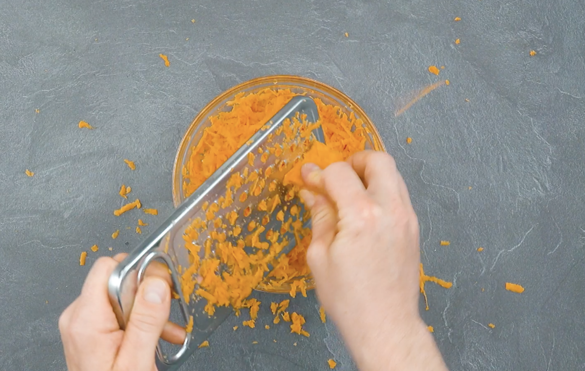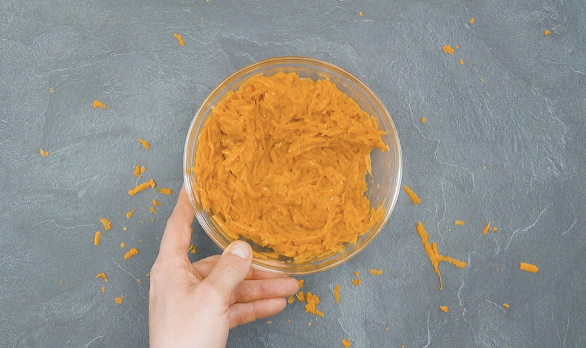 3. Schäle die Süßkartoffeln und reibe sie ebenfalls mit einer Reibe grob in eine Schüssel (bzw. wiederum in ein Küchentuch). Drücke auch hier die Flüssigkeit heraus und gib die Raspel dann in eine Schüssel.