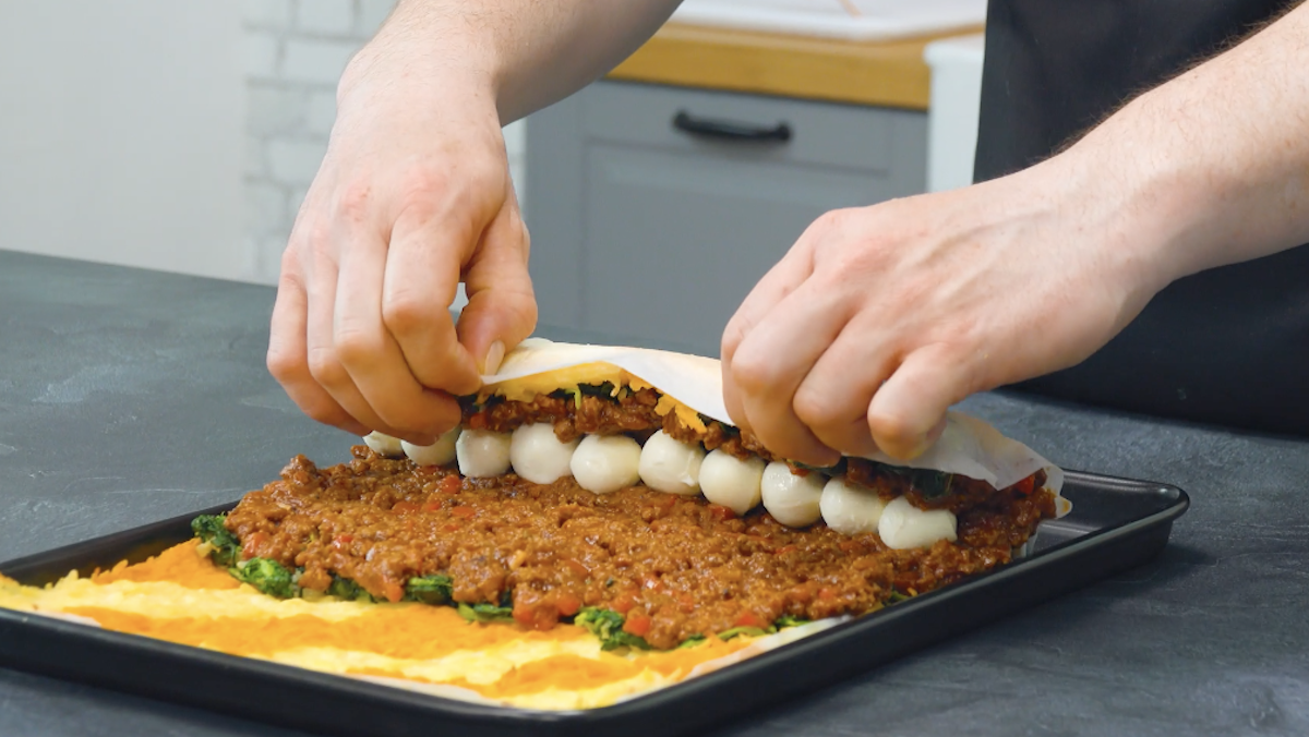 9. Lege außerdem die Mini-Mozzarellas in einer Reihe auf das Hackfleisch und rolle alles mithilfe des Backpapiers zu einer Rolle zusammen.
