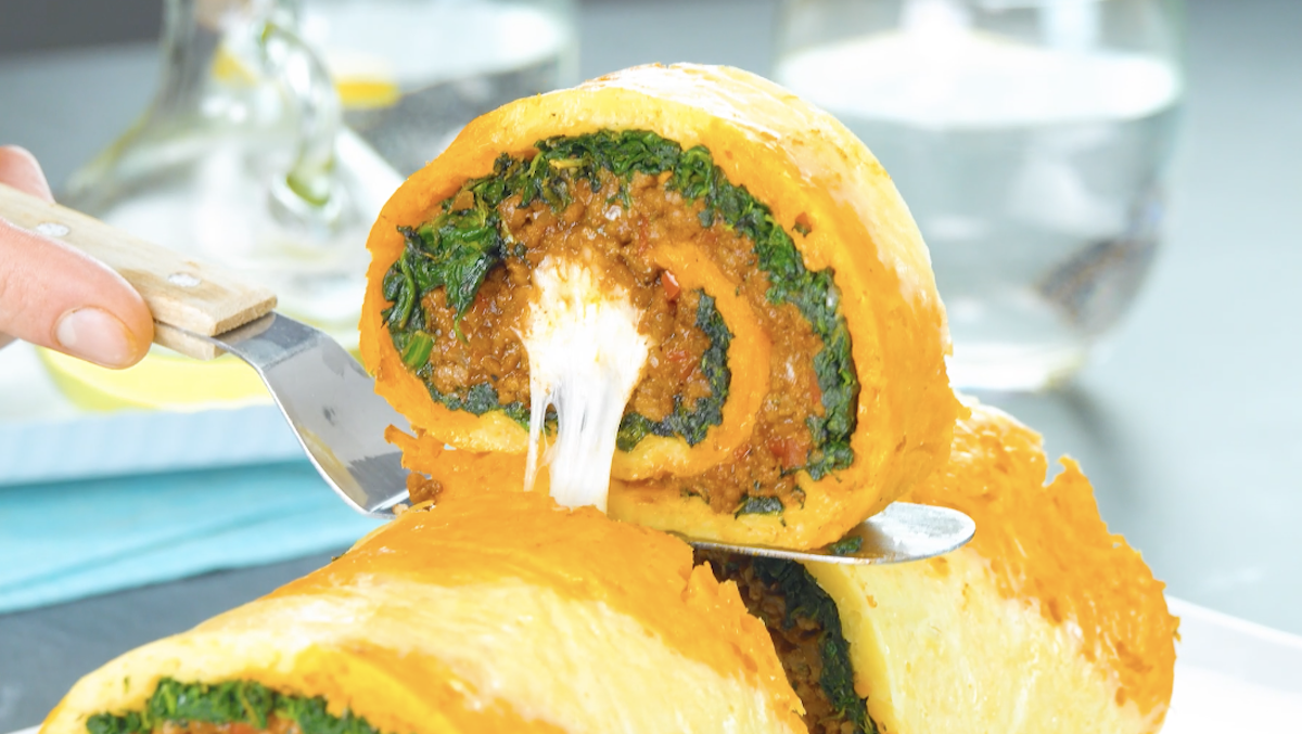 Aus roh geriebenen Kartoffeln kann man herrliche Gerichte zaubern, wie zum Beispiel Kartoffelrösti oder Reibekuchen. Auch wir lieben Kartoffelrösti, aber am liebsten natürlich in der XXL-Variante. Im Folgenden zeigen wir dir, wie man eine Kartoffelrösti-Rolle aus geriebenen Kartoffeln und Süßkartoffeln supereinfach zubereitet. Ergänzt wird diese schmackhafte Rolle mit Spinat, Hackfleisch und einem herrlichen Kern aus geschmolzenem Mozzarella.