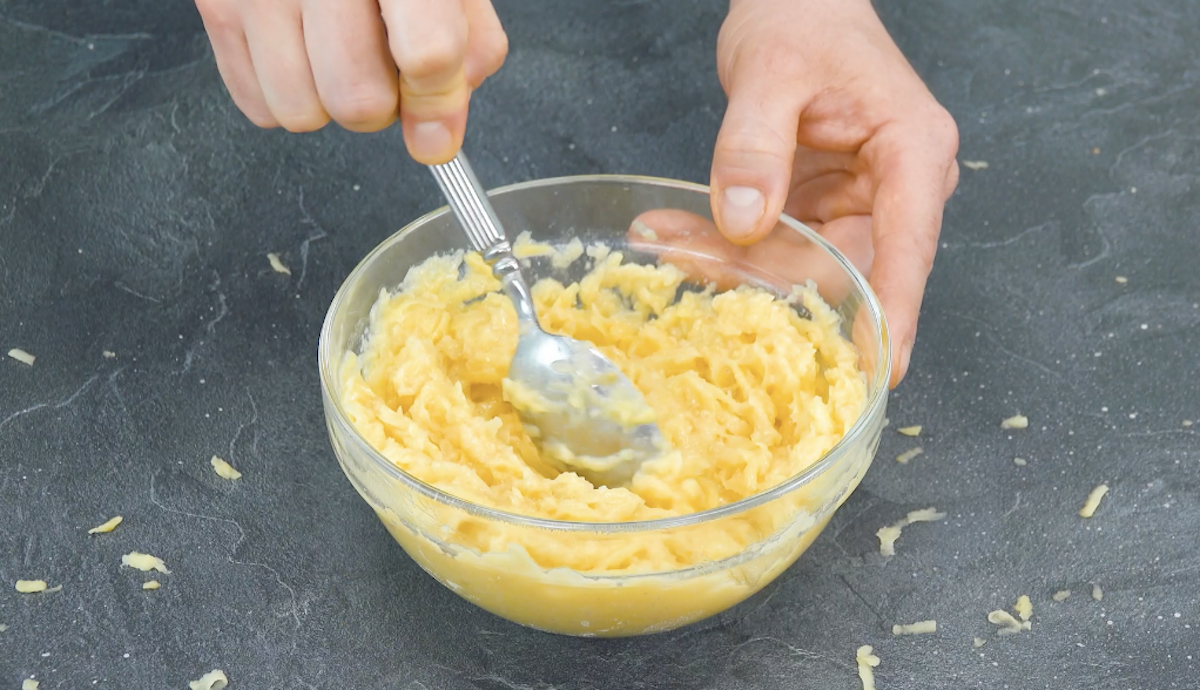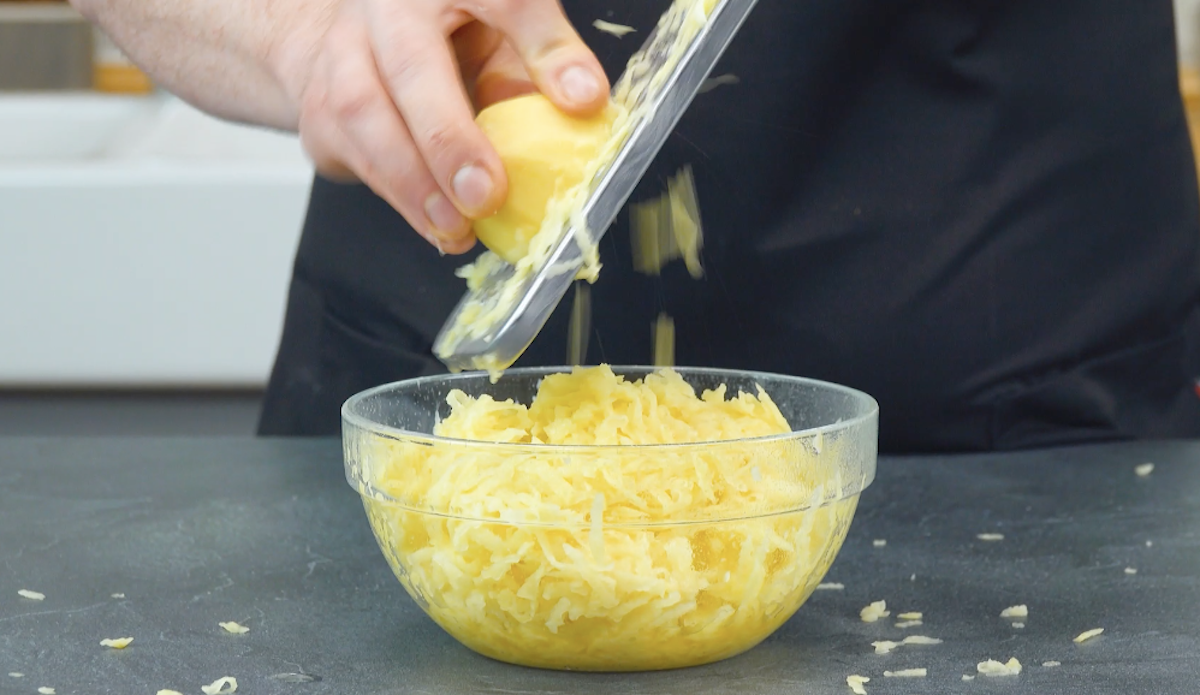1. Schäle die Kartoffeln und reibe sie grob mit der Reibe in eine Schüssel. Noch besser ist es, wenn du die Kartoffeln in ein Küchentuch raspelst, dieses dann auswringst und so die Flüssigkeit herausdrückst.