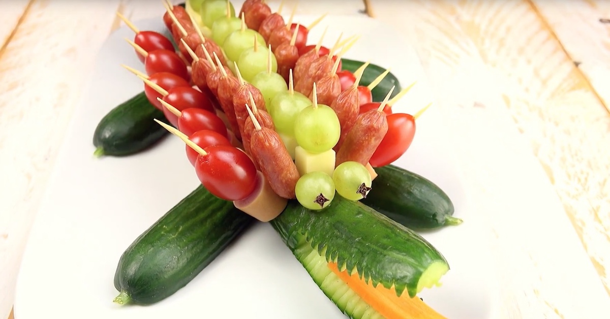 So geht es: Trenne zuerst bei den beiden kleineren Gurken an einer Seite das Ende schräg ab. Halbiere dann die Gurken. Die vier Stücke dienen später als Krokodilbeine. Die andere Gurke wird zum Krokodilkörper. Schneide hierfür ebenfalls an einer Seite das Ende – diesmal gerade – ab. Mache dann längs an diesem Ende einen ca. 10 cm langen Einschnitt in Form eines spitzwinkligen Dreiecks, um das Maul zu gestalten. Dieses sollte nicht genau auf mittlerer Höhe, sondern eher im unteren Drittel sitzen. Schnitze dann gleichmäßige Zacken in Ober- sowie Unter„kiefer“, damit das Krokodil Zähne bekommt.  Statte den Körper nun mit den Beinstücken aus und lege dem Reptil einen in Zungenform geschnittenen Möhrenstreifen in den Mund. Als Augen benutzt du Weintrauben, die du mit Zahnstochern auf der Oberseite des Gurkenkörpers befestigst. Als letzten Schliff kannst du Nelken als Pupillen auf die Augen setzen. An diesem Punkt sind deiner Kreativität fast keine Grenzen gesetzt: Nimm Trauben, Salami, geschnittene Würstchen, gewürfelten Käse und Tomaten und pikse immer ein bis zwei der Zutaten auf einen Zahnstocher. Ordne die bunten Spießchen in 5 Reihen seitlich und oben entlang des Körpers an, sodass die schmackhafte Echse zum Schluss mit bunten „Stacheln“ übersät ist. Da probiert man doch gerne mal Krokodil.