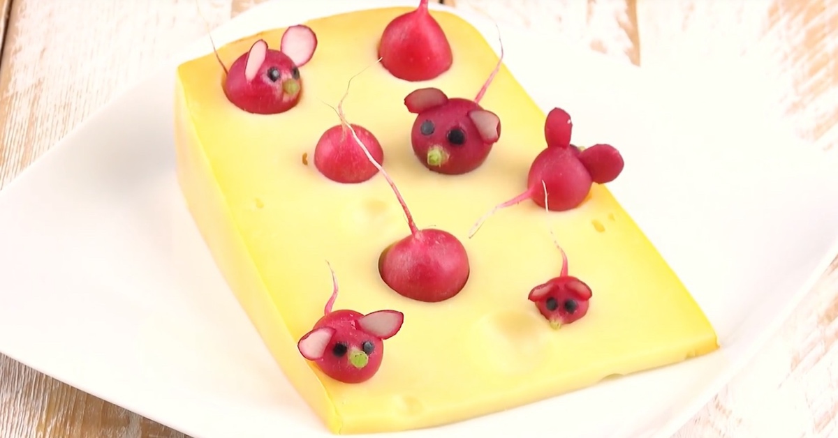 So geht es: Schneide zunächst das obere Ende der Radieschen (das mit Blättern) so zurecht, dass es die Form eines Stöpsels erhält. Dieser wird die Mausnase darstellen. Die Wurzel wird das Schwänzchen. Die Knollenmäuse werden später übrigens in die Löcher des Käsestücks gesetzt.  Von den Radieschen, die später nicht als Mäuse in den Käse kommen, schneidest du rundherum kleine Scheiben ab. Diese werden den Mäusen als Ohren eingesetzt. Dafür musst du an entsprechender Stelle zwei Schnitte in die Radieschen machen. Schneide nun eine Olive in so kleine Stückchen wie möglich und setze zwei davon als Augen zwischen Nase und Ohren. Schon sind die Tierchen bereit für ihren Platz in den Käselöchern!