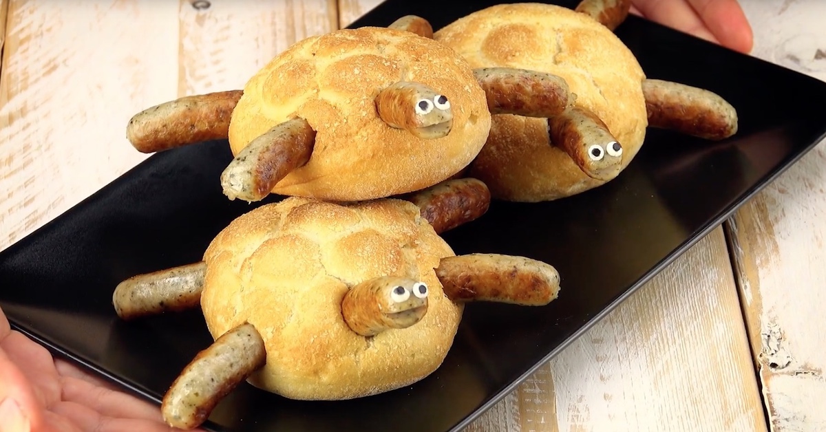 So geht es: Bohre zunächst mit einem scharfen, spitzen Messer 5 Löcher in jedes Brötchen. Der Lochdurchmesser muss jeweils so groß sein, dass ein Würstchen hineinpasst. Setze für den Schildkrötenkopf eines der Löcher etwas höher an als die anderen. Stecke dann die Würstchen in die Brötchenlöcher. Aus der „Kopfwurst“ schneidest du nun für den Mund vorne eine Ecke heraus. Anschließend setzt du darüber 2 Tupfer Mayonnaise und darauf als Pupillen noch 2 winzige Stückchen Olive – für diese niedliche Idee haben wir uns übrigens auf der Internetseite Kochen mit Humor inspirieren lassen, auf der Wolfgang Ries seine kreativen Kochkünste teilt.
