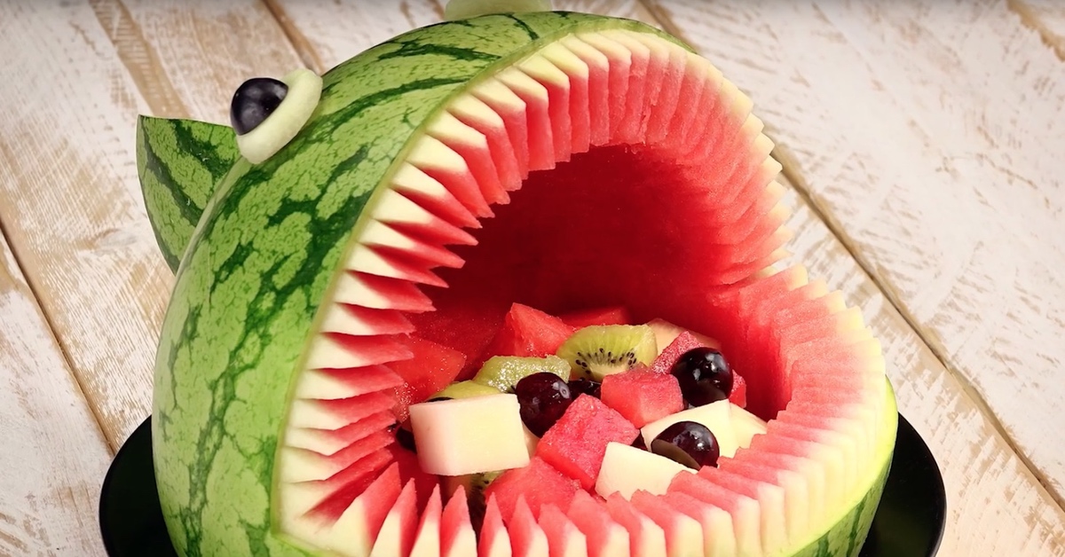 So geht es: Schneide mit einem Brotschneidemesser das obere Ende der Melone etwas abgeschrägt ab. Höhle sie anschließend mit einem Löffel vollständig aus. Dann stellst du sie mit der Öffnung nach unten auf ein Holzbrett. Nimm nun wieder das Messer zur Hand und mache ca. 5 cm über dem Brett einen waagrechten Schnitt. Dieser sollte etwa die Hälfte der Frucht durchtrennen. Dort stoppst du und setzt einen weiteren Schnitt oben in der Mitte an. Schneide so weit nach unten, bis du auf das Ende des ersten Einschnitts triffst und du das große Stück leicht herausnehmen kannst.  Kreiere nun mit einem kleineren Messer einen Rand um das entfernte Stück: Dafür schneidest du einen Streifen von ca. 2 cm Breite rundherum um den großen Ausschnitt, der später das Haimaul sein wird. Mache den Schnitt aber nur etwa einen halben Zentimeter tief. Schneide den Rand nun auch innen ab und löse ihn vom Rest der Melone. Anschließend gestaltest du die Zähne. Dafür machst du zuerst einen schrägen Schnitt in beide Ecken des Mauls und zackst dann den Rand rundherum.  Als Flosse brauchst du ein großes dreieckiges Stück des „Mauls“, das du zuvor entfernt hast. Das Dreieck befestigst du am Rücken der Melone mithilfe zweier Zahnstocher. Die beiden anderen benutzt du, um die Augen anzubringen. Diese bestehen aus 2 rund geschnittenen Stücken der anderen Melonensorte, die du gewählt hast, und jeweils einer halbierten Traube, die obendrauf gesetzt wird. Zum Schluss bereitest du einen Obstsalat mit den Melonenresten und den Früchten deiner Wahl zu und befüllst das Haimaul damit. So wirkt die Tierart doch gar nicht mehr bedrohlich, oder?