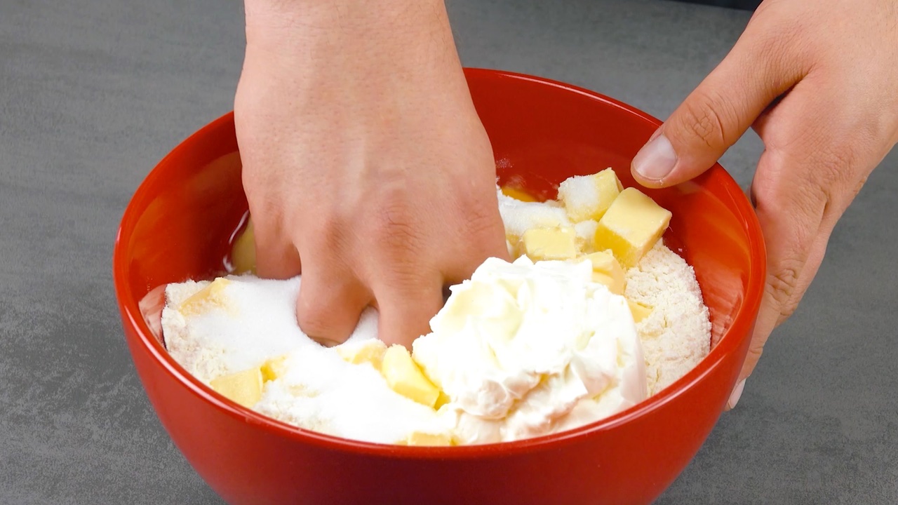 1. Als Erstes solltest du mit dem Teig beginnen, da er kalt gestellt werden muss. Gib dafür nacheinander alle Zutaten in eine Schüssel und verknete sie mit den Händen zu einem glatten Teig. Schlage ihn dann in Folie ein und lasse ihn im Kühlschrank für 1 Stunde ruhen.