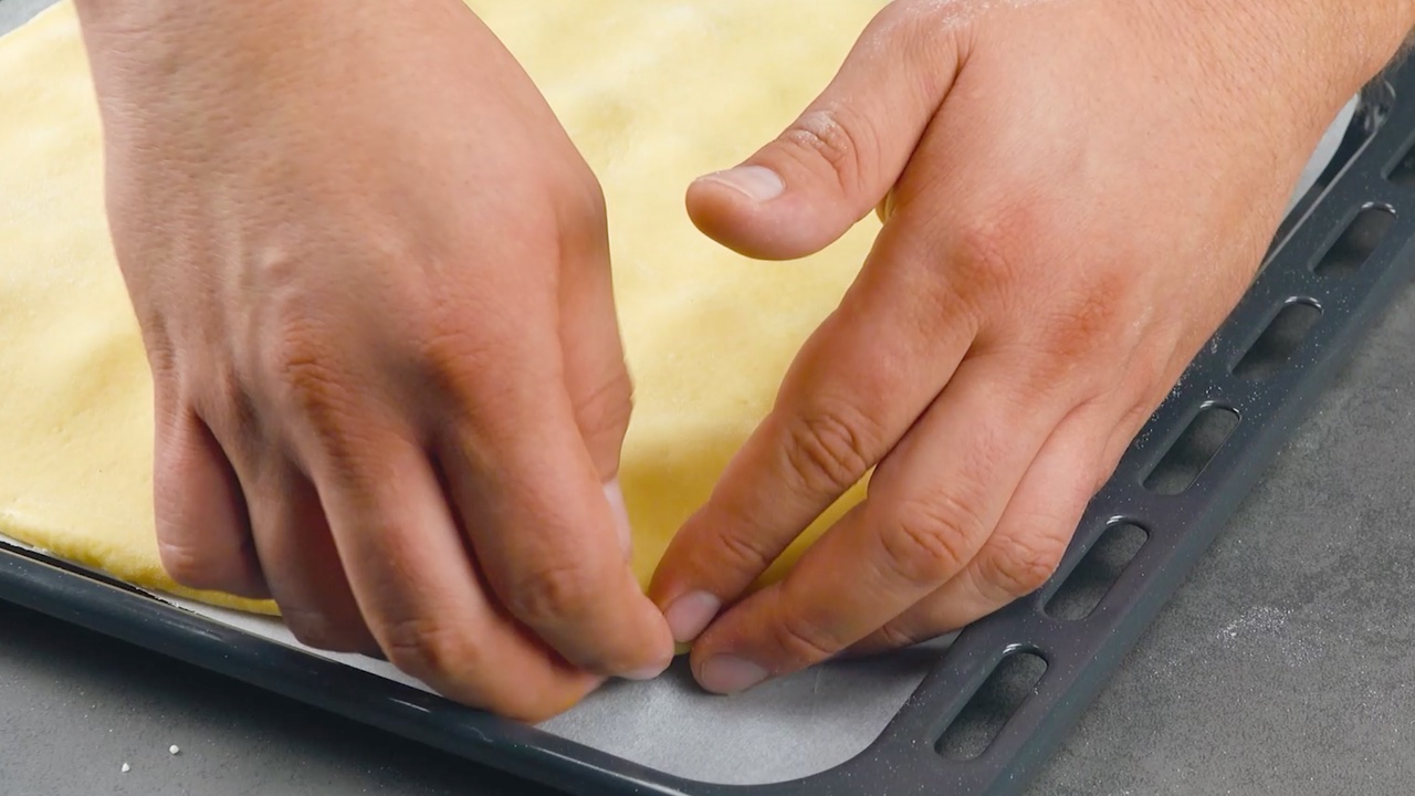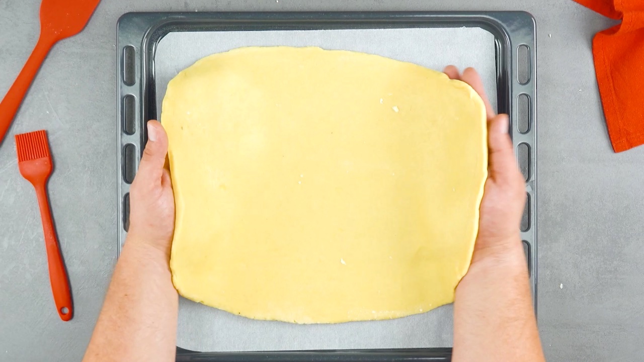 2. Nachdem du den Teig aus dem Kühlschrank genommen hast, halbierst du ihn, rollst eine Hälfte mithilfe eines Nudelholzes gleichmäßig aus und legst diese auf ein mit Backpapier belegtes Backblech. Der ausgerollte Teig sollte dabei ungefähr 30 x 30 cm groß sein.