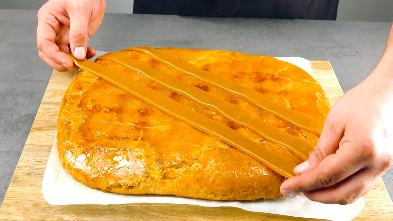 9. Der abgekühlte Kuchen wird nun mit Honig eingepinselt, damit die Karamell-Streifen gleich besser an ihm haften. Lege die Streifen danach quer über den Kirschkuchen und lasse dabei immer ein Stückchen Abstand zwischen ihnen.
