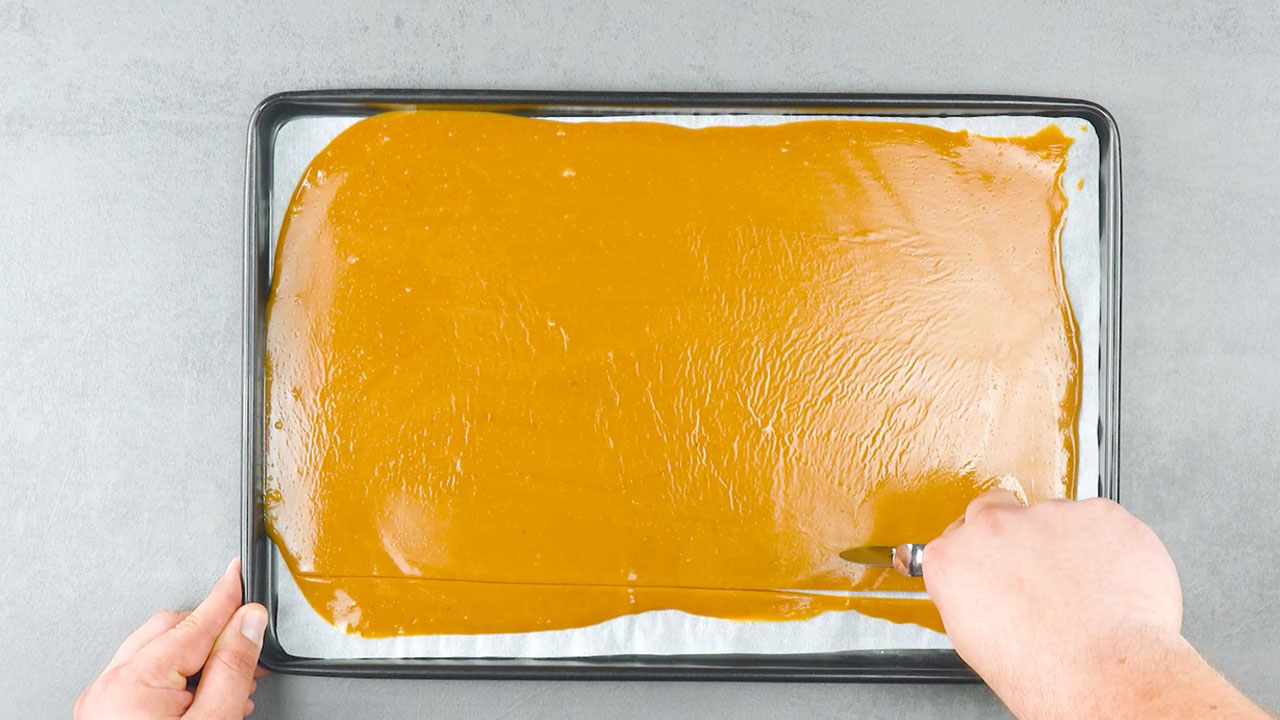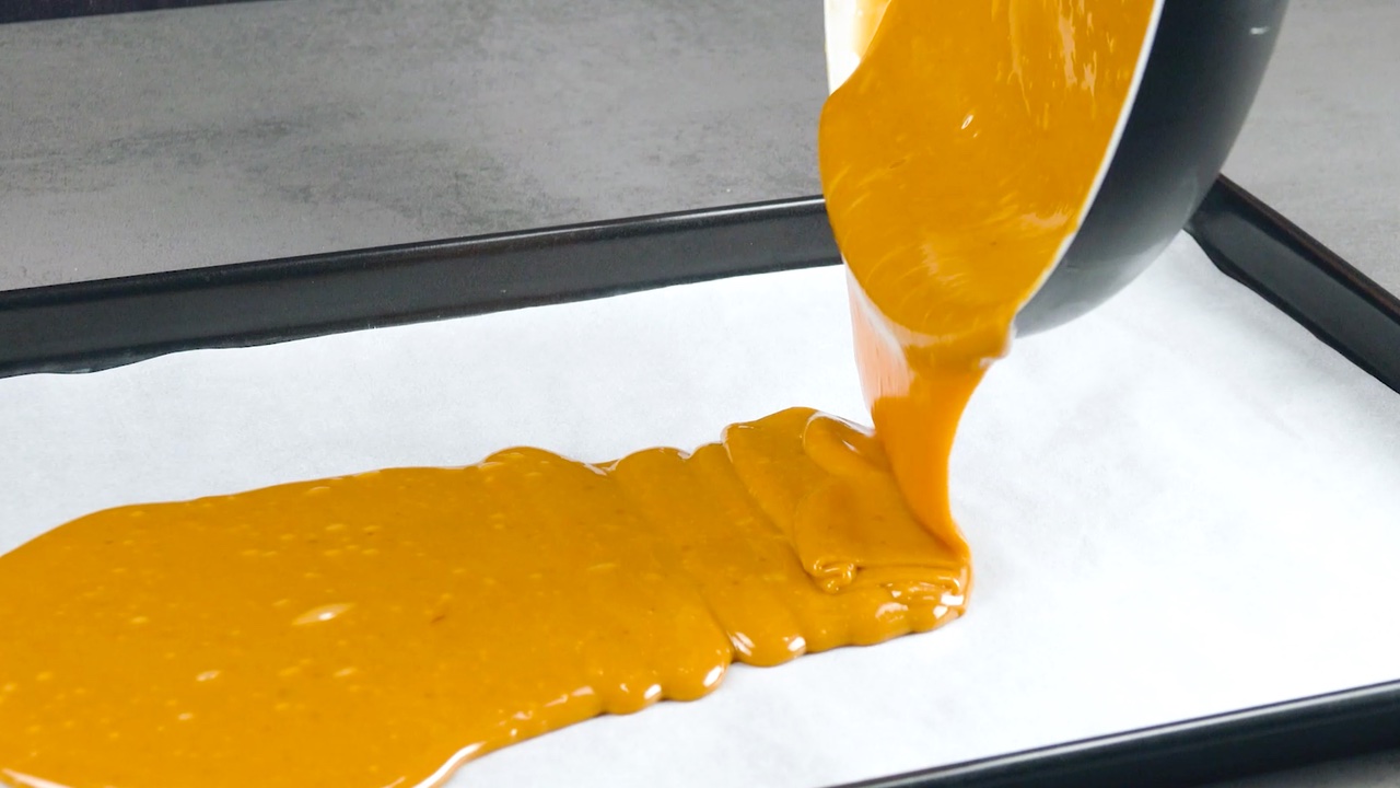 7. Gib die klebrige Karamellmasse dann auf ein mit Backpapier ausgekleidetes Backblech und verteile sie gleichmäßig auf ca. 24 x 38 cm. Lege das Backblech samt Karamell anschließend für ungefähr 10 Minuten zum Abkühlen in den Kühlschrank.