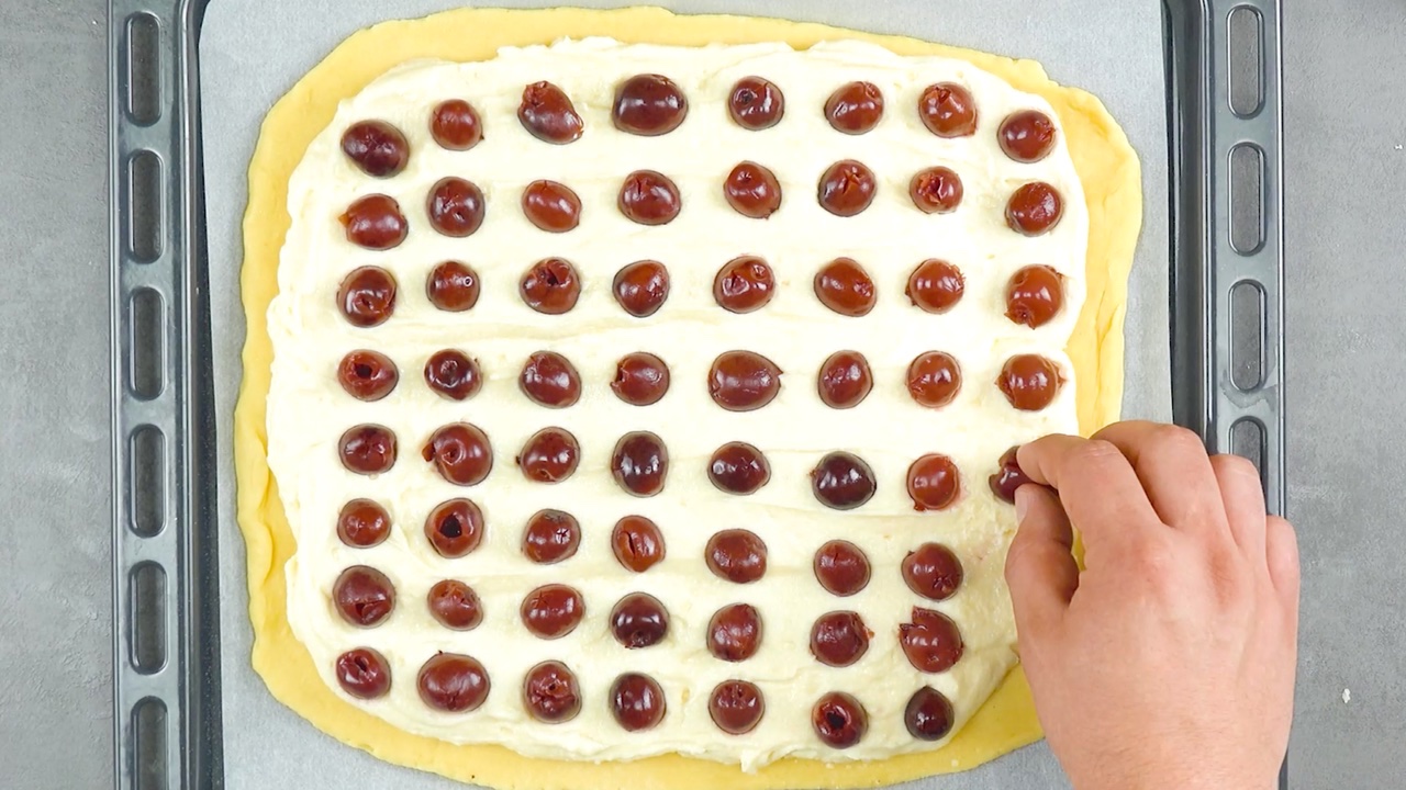 3. Nun stellst du die Creme her, indem du den Frischkäse, 2 Eier und den Zucker in eine Schüssel gibst und mit einem Handrührgerät aufschlägst. Sollte sie dir zu flüssig erscheinen, füge noch 1 Päckchen Sahnesteif hinzu. Anschließend verteilst du die Cremefüllung gleichmäßig auf dem Teig bis zum Rand und legst die Kirschen in einem regelmäßigen Raster darauf.
