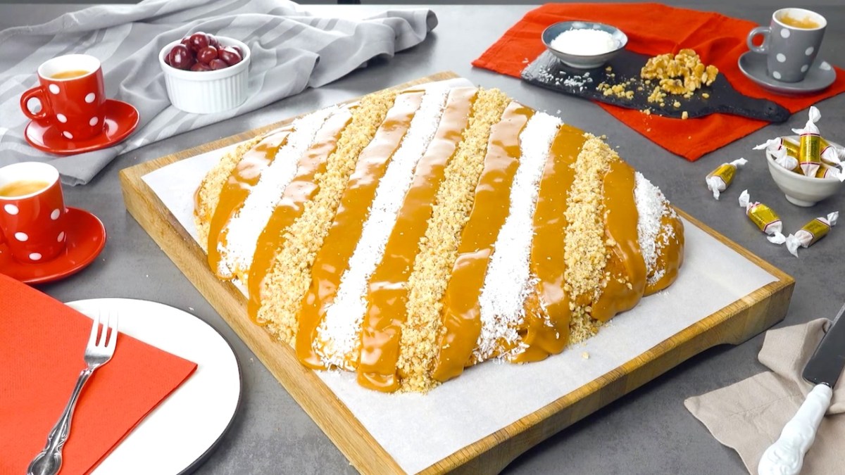10. Abschließend werden die so entstandenen „Lücken“ abwechselnd mit den Kokosraspeln und den gehackten Nüssen verziert – und fertig ist der leckere Kirschkuchen mit Karamell.