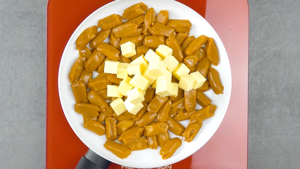 6. Während der Kuchen abkühlt, kannst du die Karamellbonbons zusammen mit der Butter in einer Pfanne oder einem Topf bei kleiner Hitze schmelzen und zu einer geschmeidigen Masse verrühren.