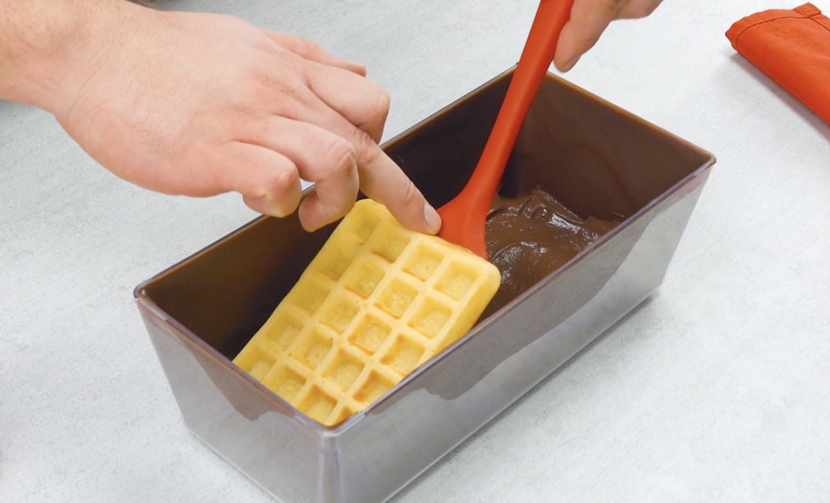4. Sobald die Kuvertüre in der Kastenform angezogen ist, kannst du mit dem Zusammenbau beginnen. Gib ca. 3 EL Schokocreme in die Form und verteile sie gleichmäßig. Lege dann 2 Waffeln auf die Creme.