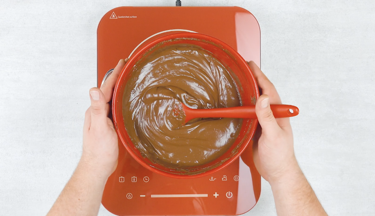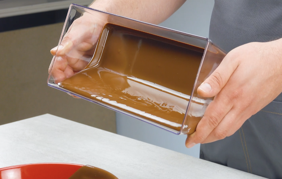 2. Kommen wir nun zur Form. Erhitze ca. 85 % der Kuvertüre auf etwa 43 °C (in der Mikrowelle) und gib dann die restlichen 15 % dazu. Lasse die Kuvertüre unter ständigem Rühren auf 27 °C abkühlen. Erhitze sie dann mit einem Föhn auf 31,5 °C und gieße die Kastenform mit der temperierten Kuvertüre aus. Lasse die Kuvertüre in alle Ecken laufen und gieße die überschüssige Menge wieder aus der Form heraus. Stelle die Form über Kopf auf ein Gitter und lasse die Schokolade 3 Minuten abtropfen. Drehe die Form dann wieder um und ziehe mit einer Palette die Kanten gerade. Wiederhole den ganzen Vorgang nochmals, damit die Schokolade auch die richtige Stabilität und Dicke hat. Im Video wird der Vorgang etwas vereinfacht gezeigt. Es ist aber wichtig, sich hier an die beschriebenen Schritte zu halten.