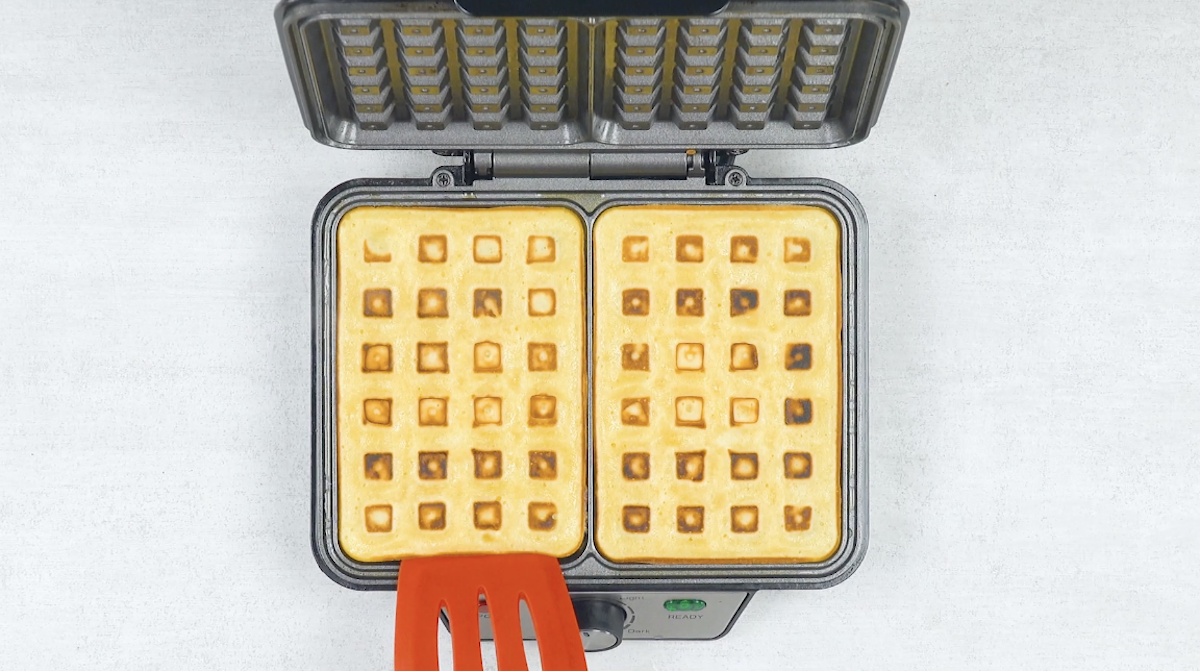 1. Als Erstes bereitest du den Waffelteig zu. Schlage Butter und Zucker zusammen schaumig auf und gib nach und nach Eier hinzu. Dann kommen noch Mehl, Milch, Wasser und Backpulver dazu. Vermische alles mit einem Handrührgerät und backe die Waffeln für ca. 5 Minuten. Verwende pro Waffel ca. 1 Kelle Teig. Wir brauchen ca. 10 Waffeln. Lasse die Waffeln danach abkühlen.
