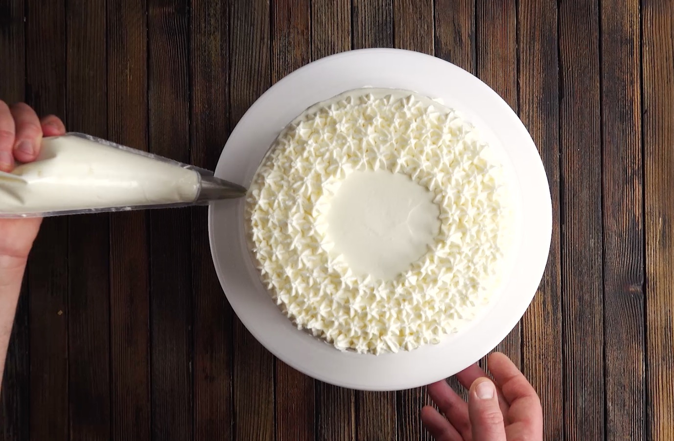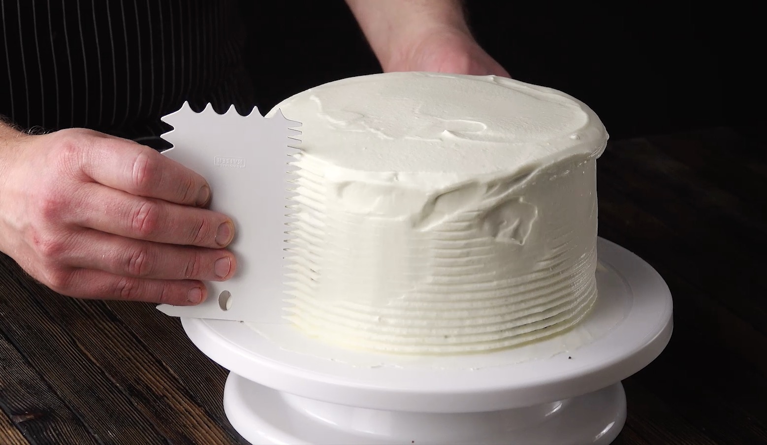 8. Verstreiche nun einen weiteren Teil der Creme rundherum. Behalte für die Dekoration allerdings noch einen kleinen Rest Creme zurück. Verziere den Rand danach mit einem gewellten Tortenkamm.