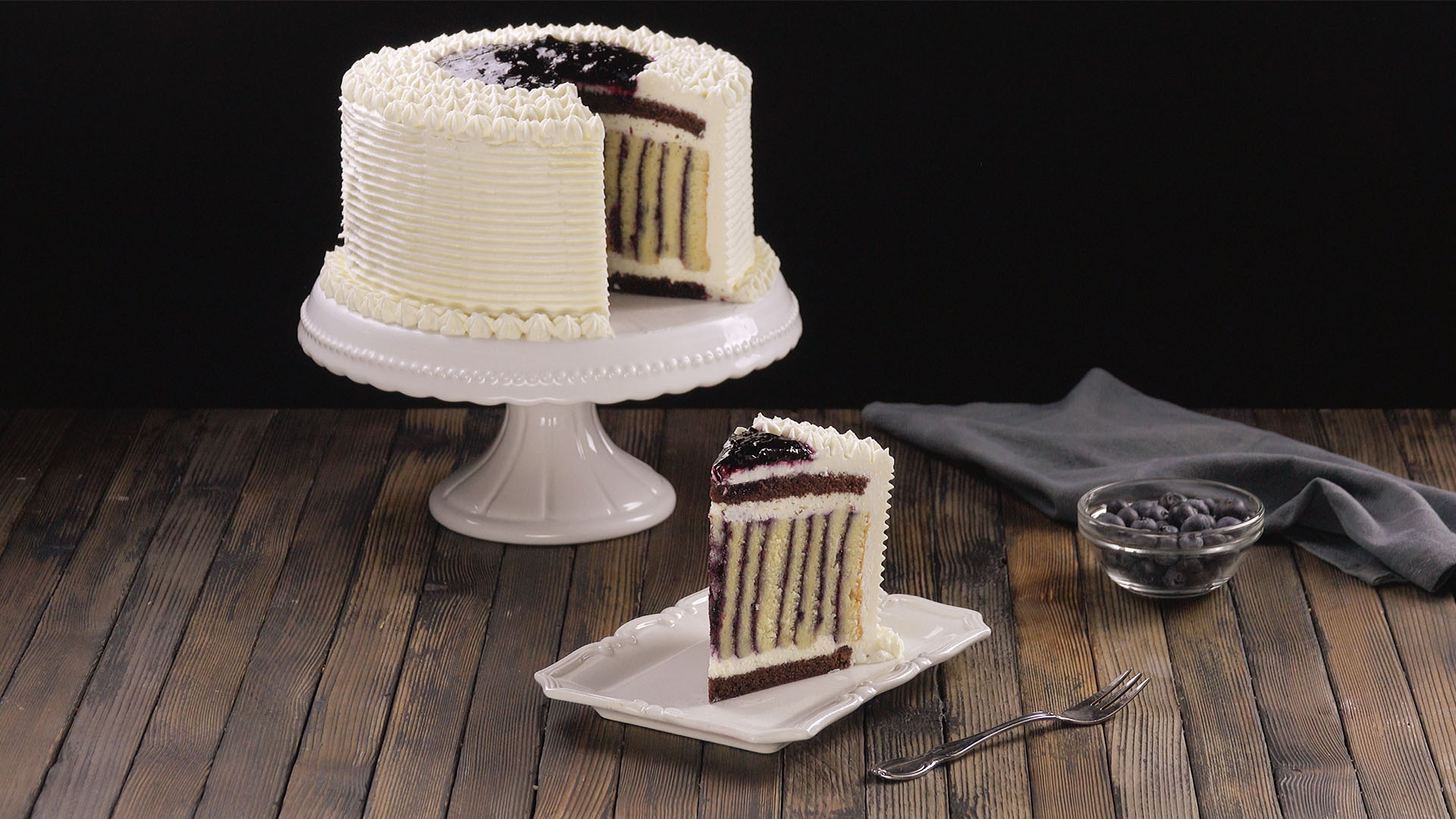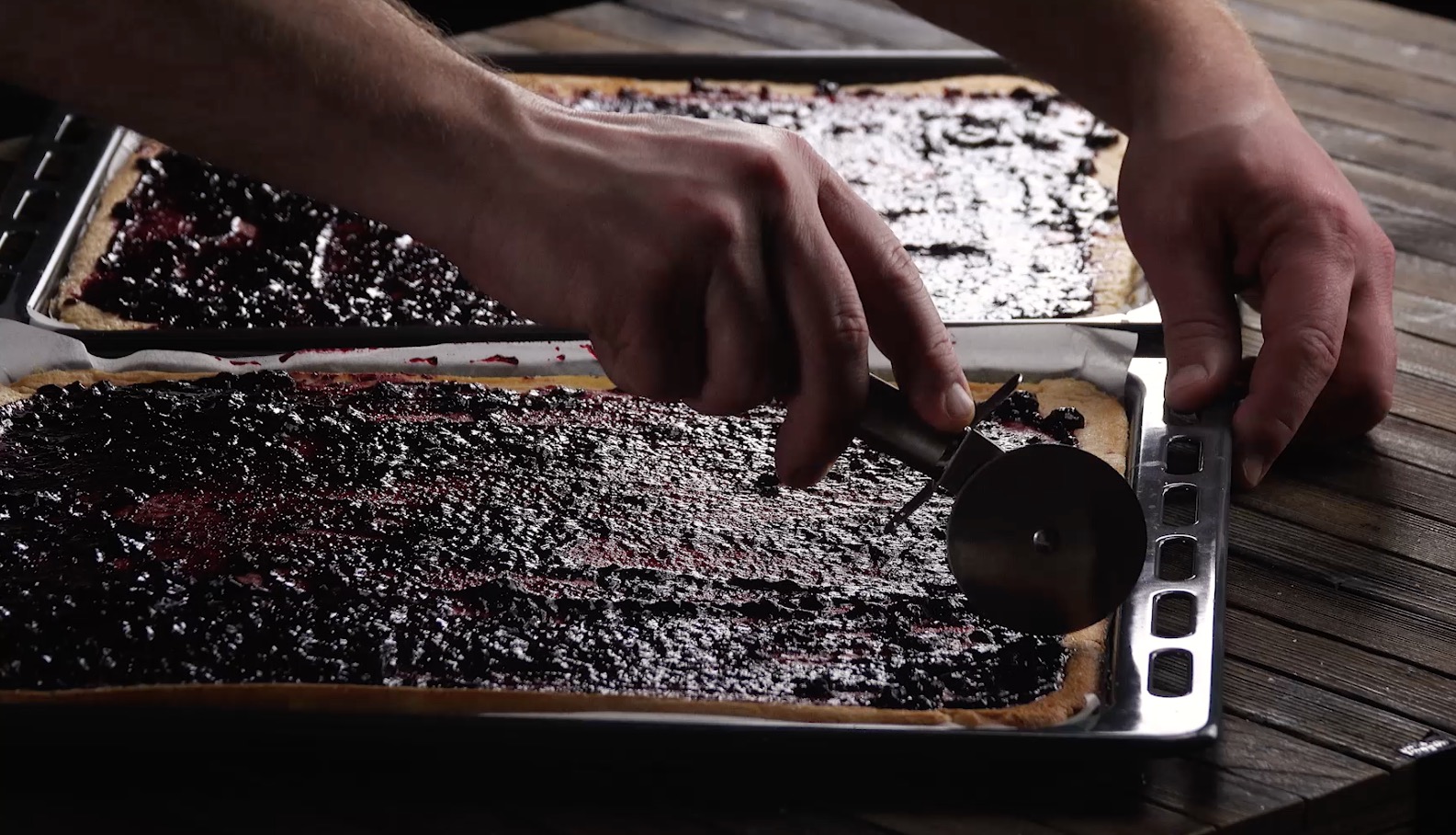 3. Lass den Teig erkalten und verteile mit einem Löffel die Blaubeermarmelade gleichmäßig auf beide Biskuitböden. Lass ein paar Löffel der Marmelade übrig. Schneide anschließend beide Böden längs in fünf gleich breite Streifen.