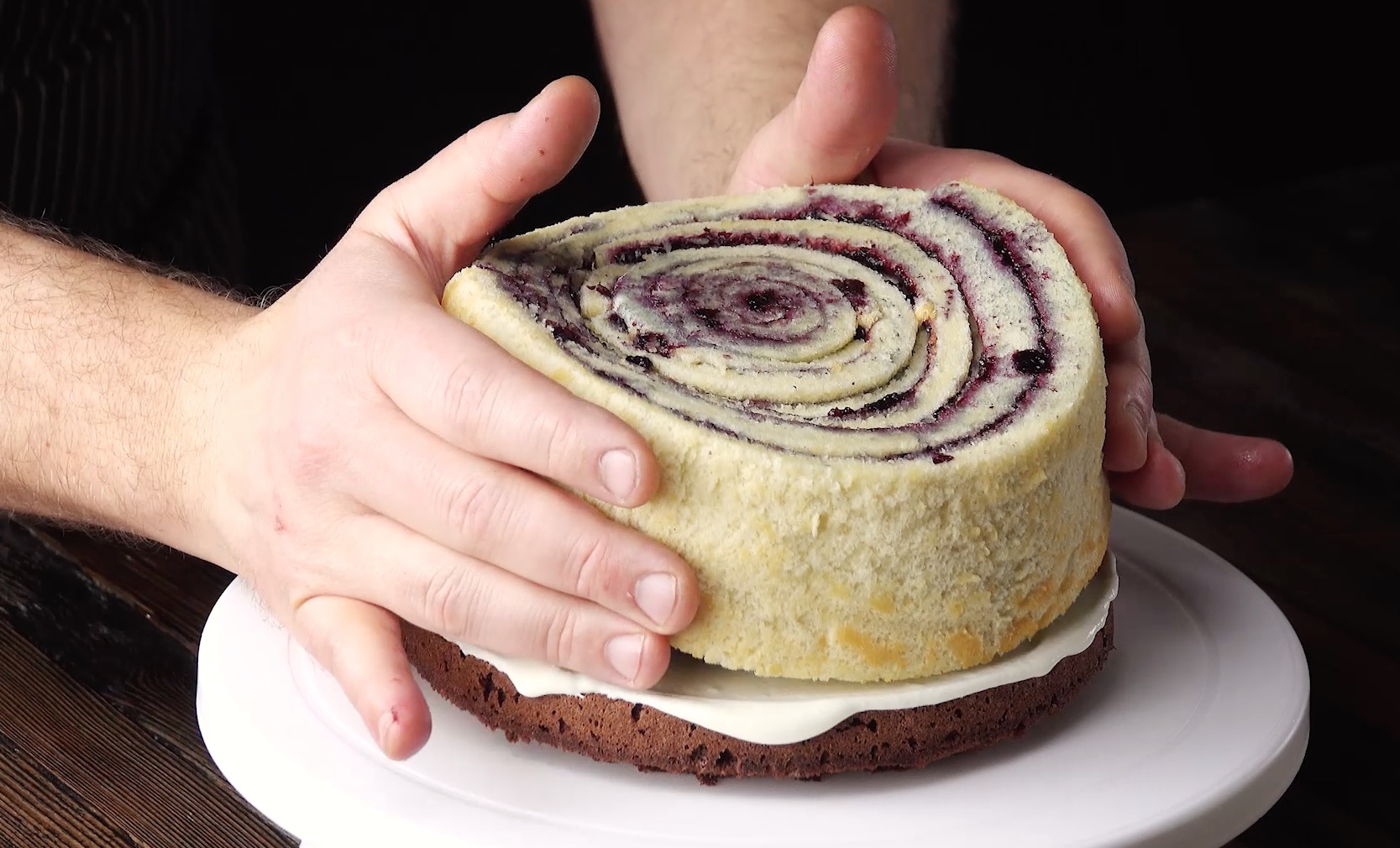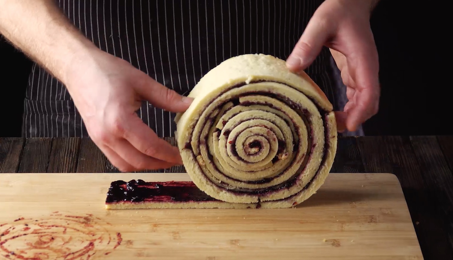 7. Setze die untere Hälfte auf eine Kuchenplatte, bestreiche sie großzügig mit der Creme und setze dann die Marmelade-Biskuit-Rolle darauf. Verteile eine weitere Schicht der Creme auf der Biskuitrolle und setze den zweiten Kuchenboden darauf.