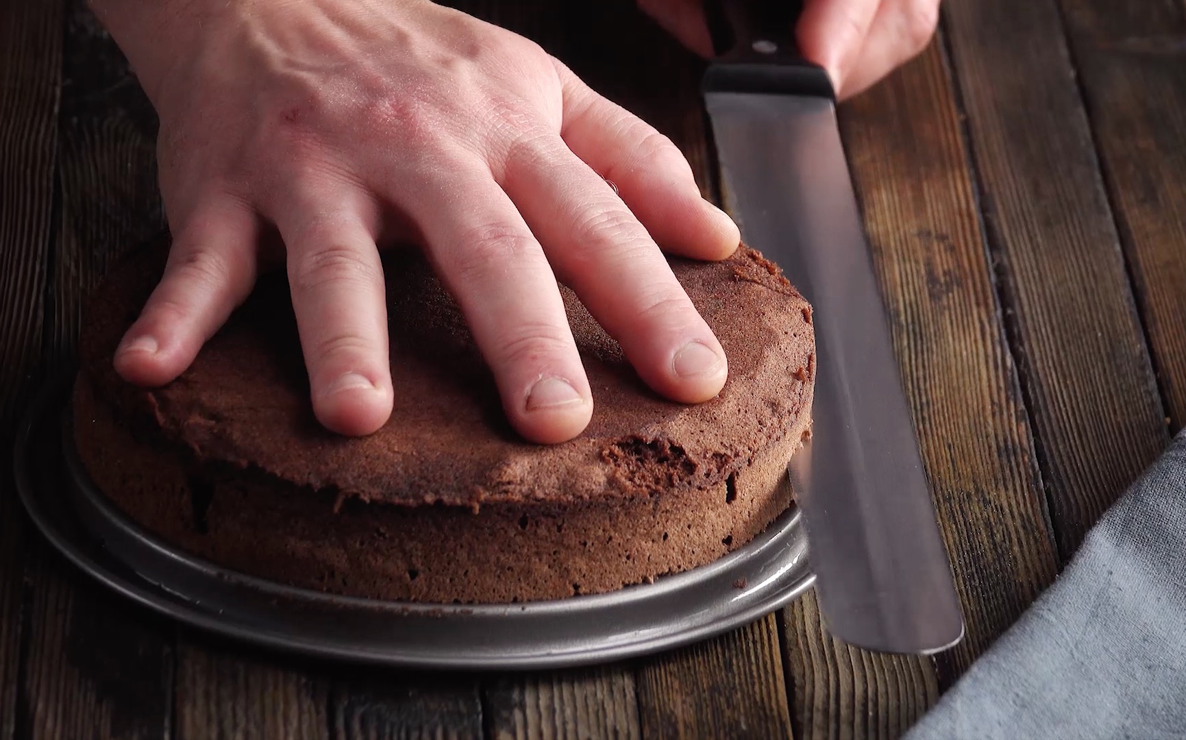 6. Lass den dunklen Biskuit anschließend erkalten und halbiere ihn mit einem scharfen Messer, sodass du zwei Kuchenböden erhältst.