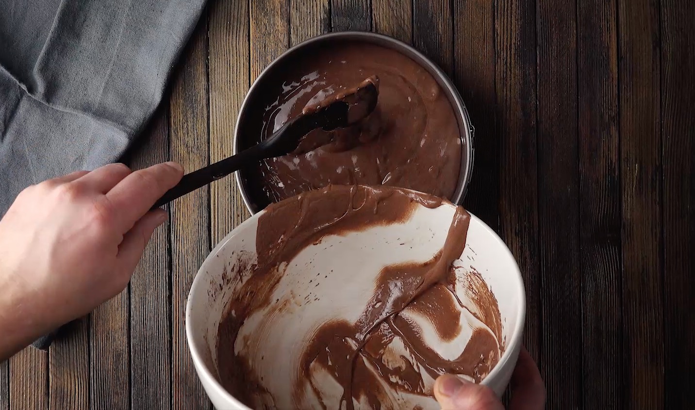 5. Schlage für die Creme den Frischkäse auf und hebe die Sahne unter. In einer anderen Schüssel verrührst du Zucker und Eigelb. Rühre dann nach und nach Kakao und Mehl ein. Fülle den Teig in eine gefettete Springform und backe ihn für 40 Minuten bei 170 °C Umluft.