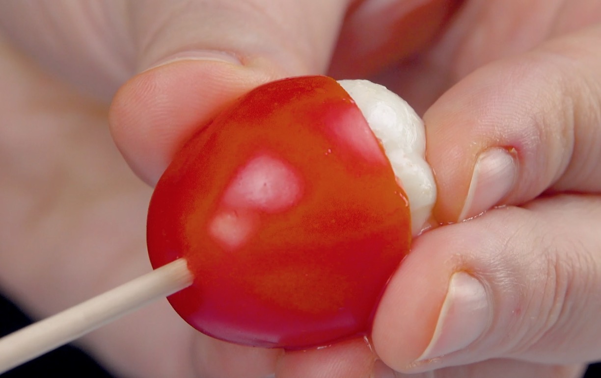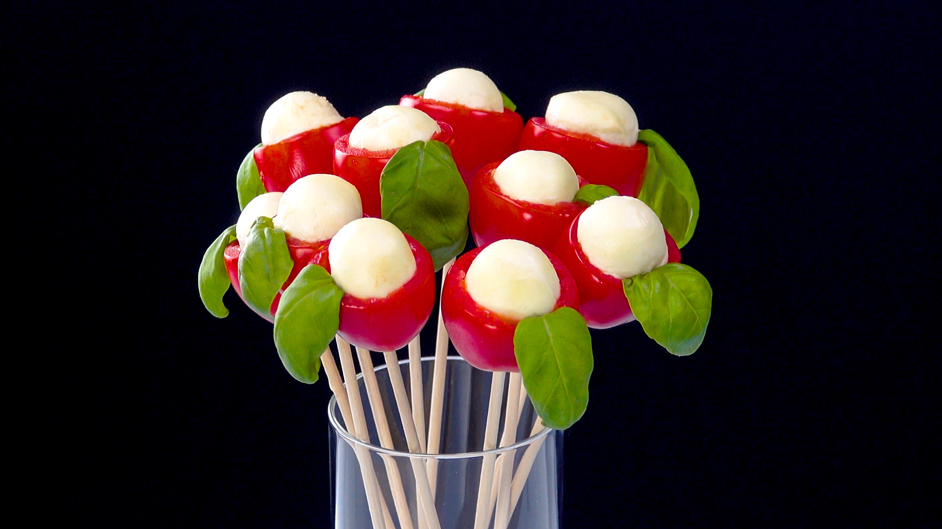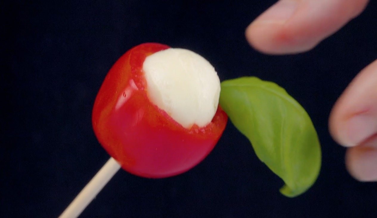 2.) Stecke eine Mozzarella-Kugel in den ausgehöhlten Teil der Frucht und dann beides zusammen auf einen Schaschlikspieß. Bohre diesen allerdings nur so weit in die Mozzarella-Tomate, dass er auf der anderen Seite nicht heraussteht.