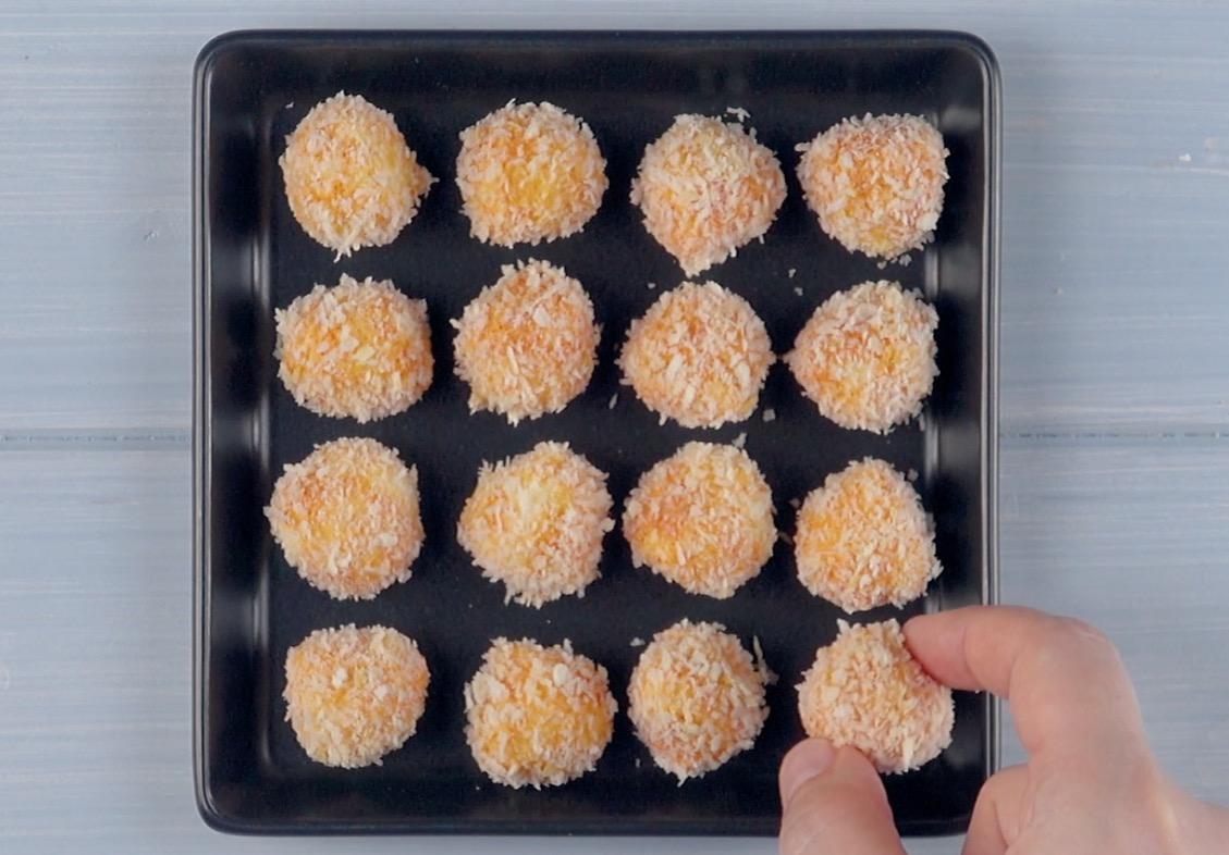 2.) Mache dich nun an die Panade: Dafür wälzt du eine Mozzarella-Kugel zuerst im Mehl, dann im Ei und dann in den Semmelbröseln, bis sie vollständig bedeckt ist.