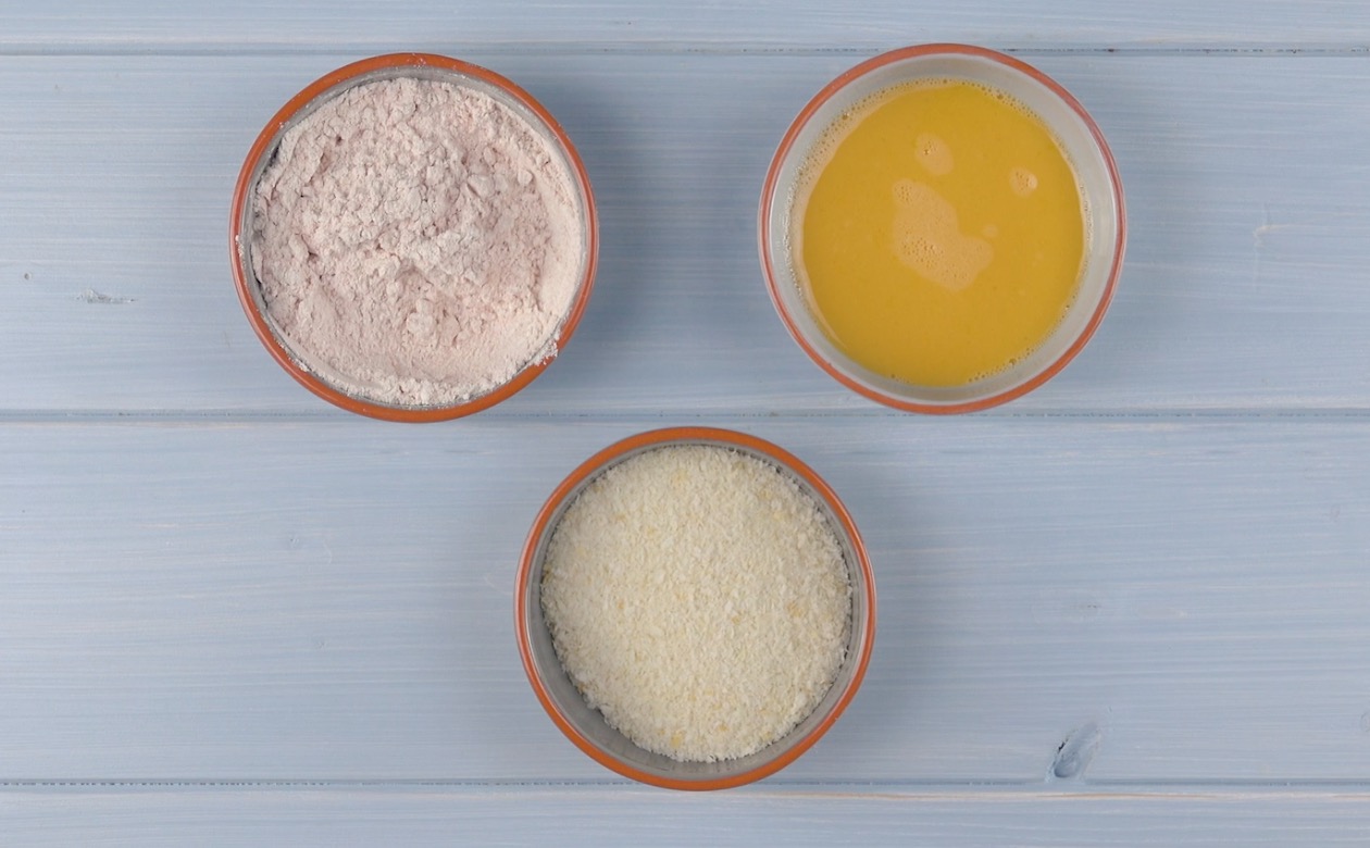1.) Vermische in einer Schüssel zuerst sorgfältig das Mehl mit dem Paprikapulver. Stelle das Ei und die Semmelbrösel in Schüsseln dazu.
