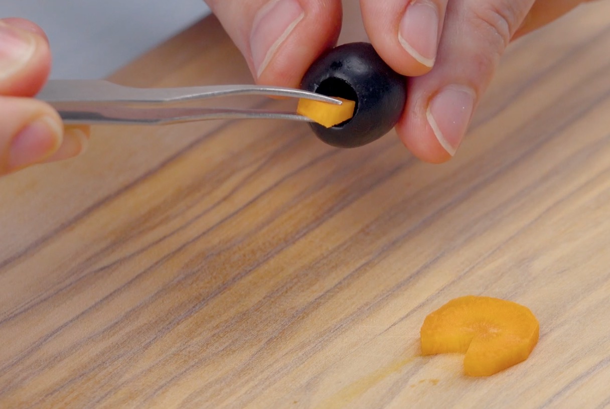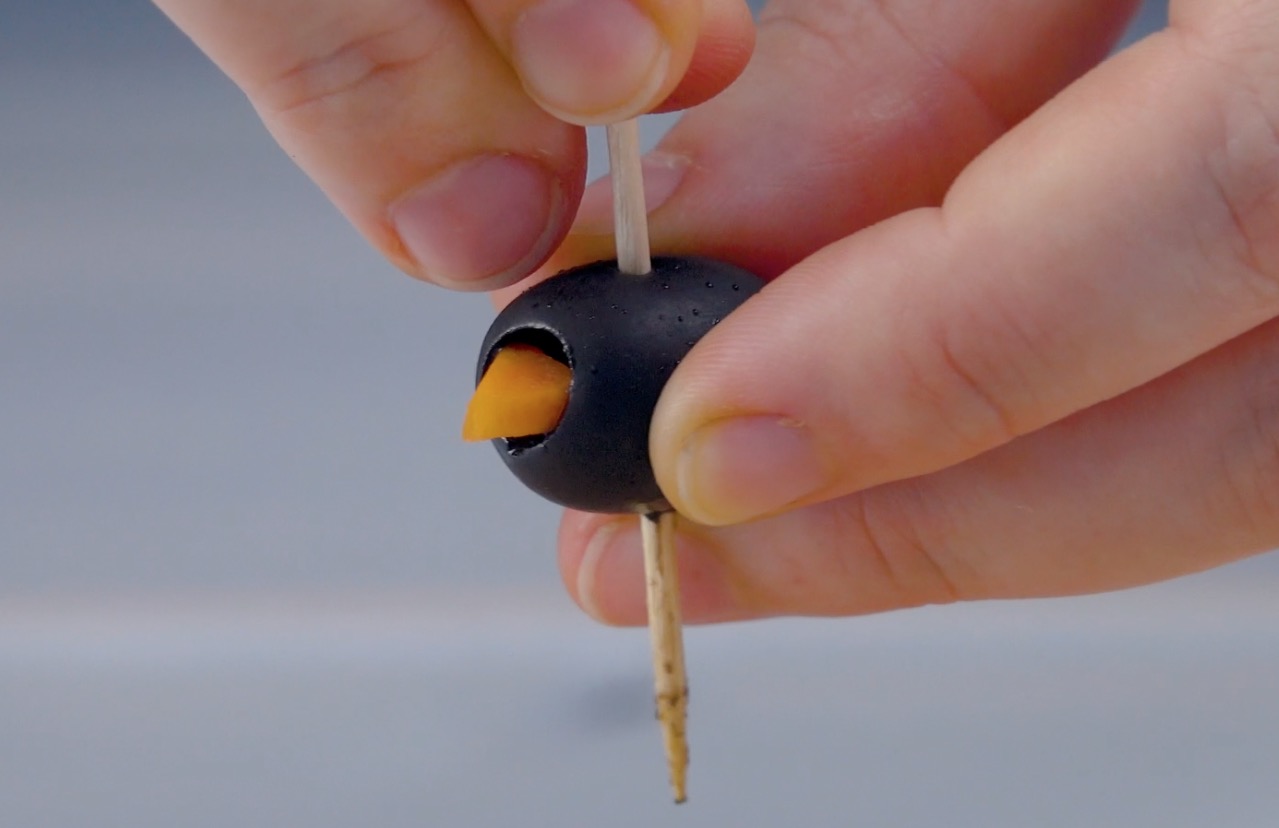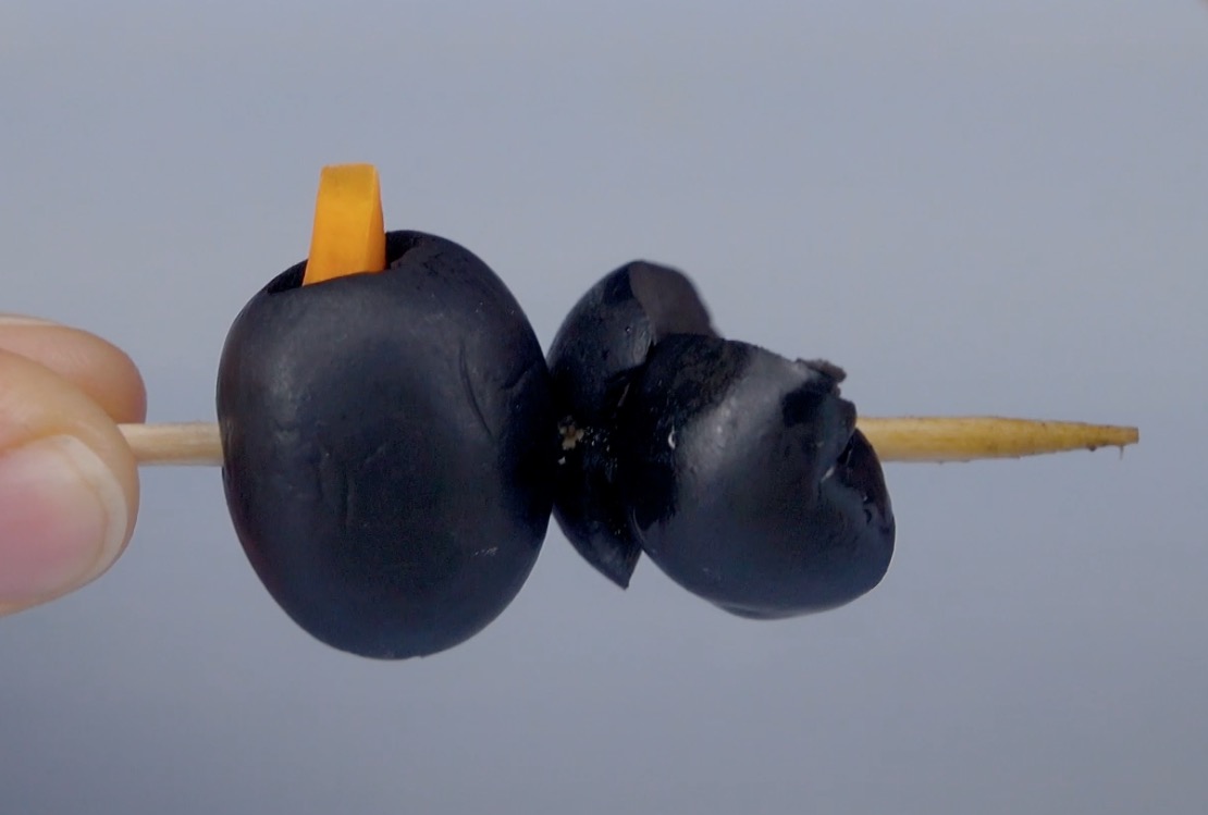 3.) Anschließend halbierst du eine Olive längs und schneidest von jeder Hälfte noch einmal längs ein Drittel ab. Stecke die zwei kleineren Stücke auch jeweils auf den Zahnstocher, eng unter die Olive mit der Karottenecke.