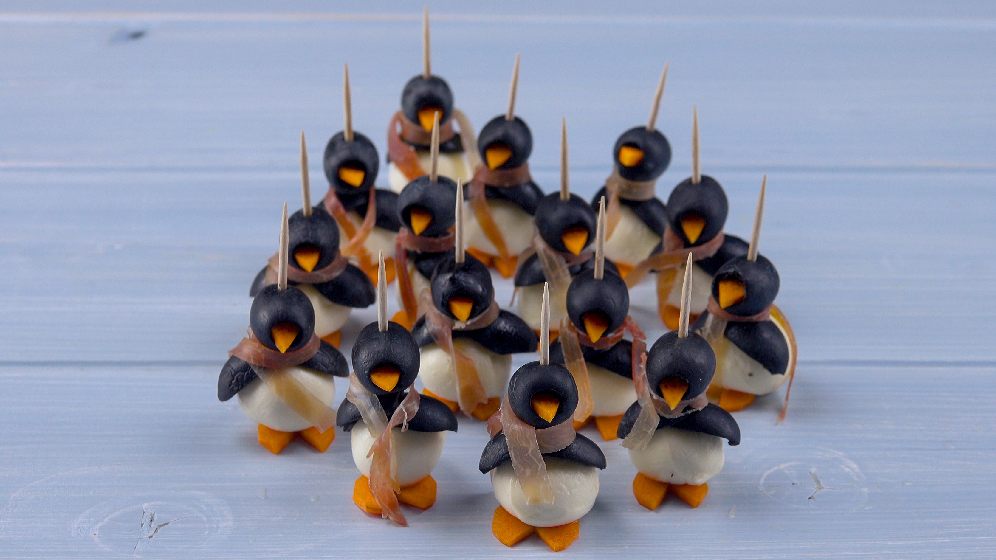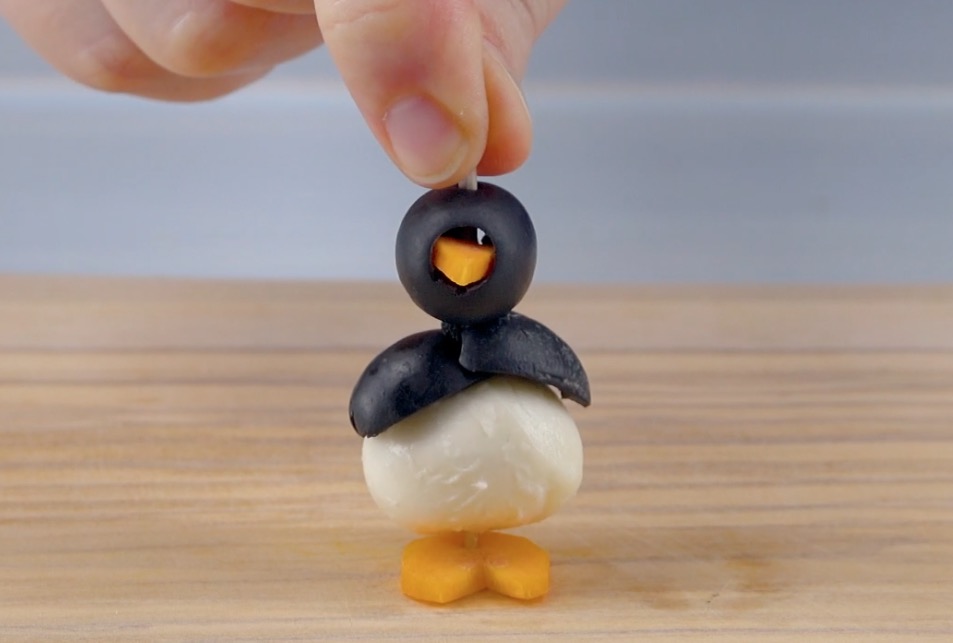 4.) Stecke unter diese „Pinguinflügel“ nun eine Mozzarella-Kugel und an das untere Ende die Karottenscheibe mit der fehlenden Ecke als Füße. Lass diese in dieselbe Richtung wie die Schnabelspitze zeigen.