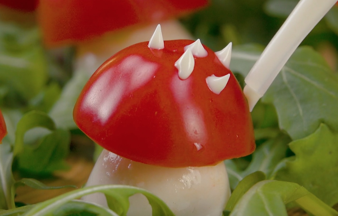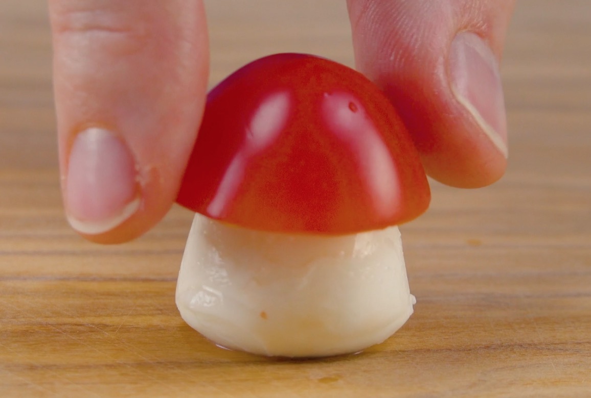 1.) Halbiere zuerst eine Kirschtomate. Stecke dann eine Hälfte auf eine Mozzarella-Kugel.
