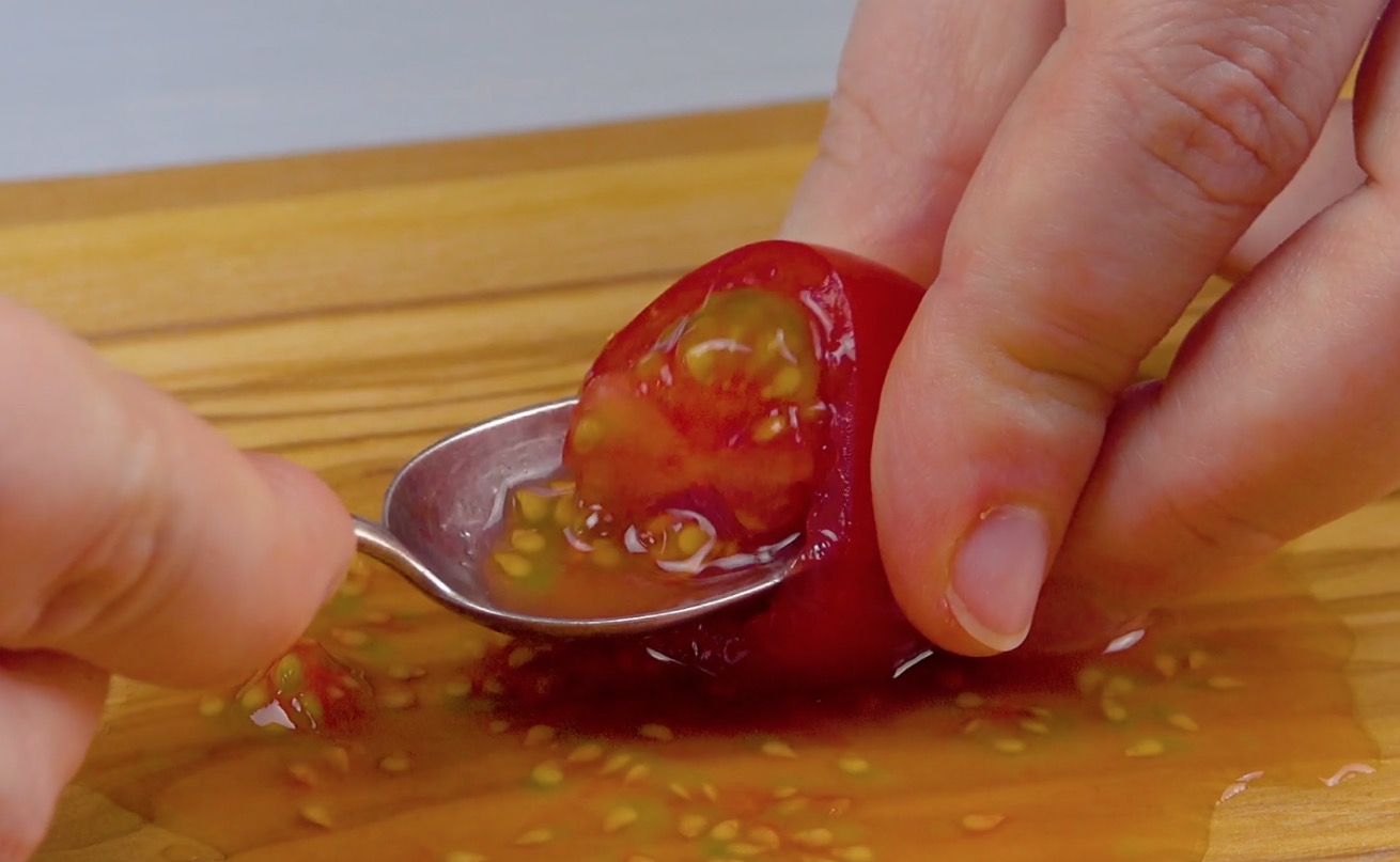 1.) Schneide zuerst die Oberseite einer Tomate ab und höhle den Rest dann mit einem Teelöffel aus.