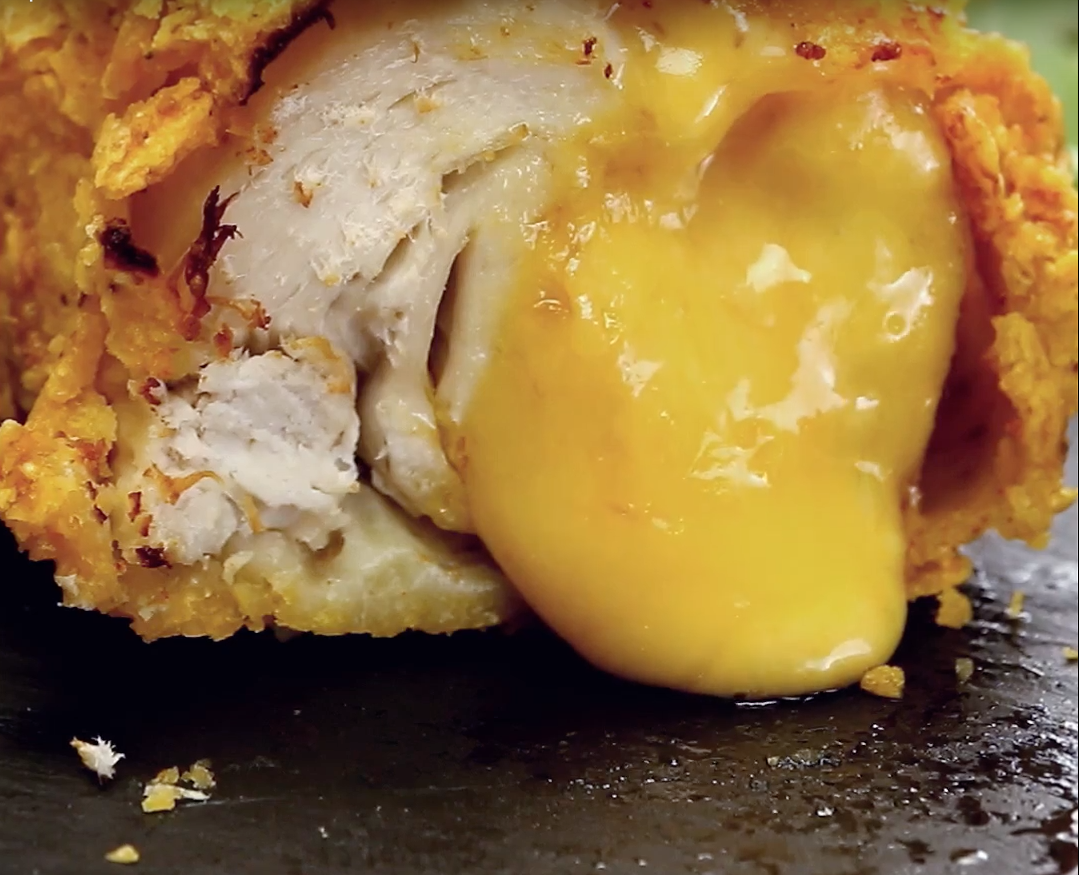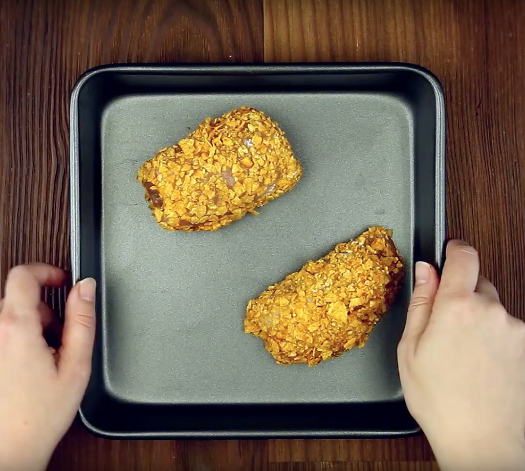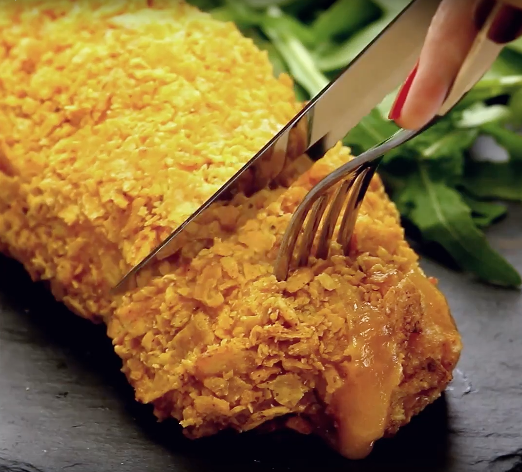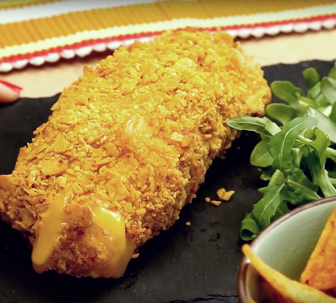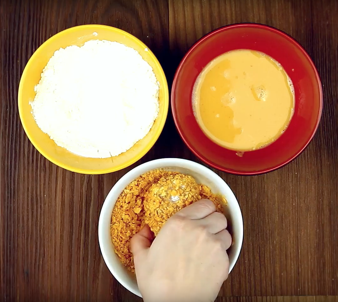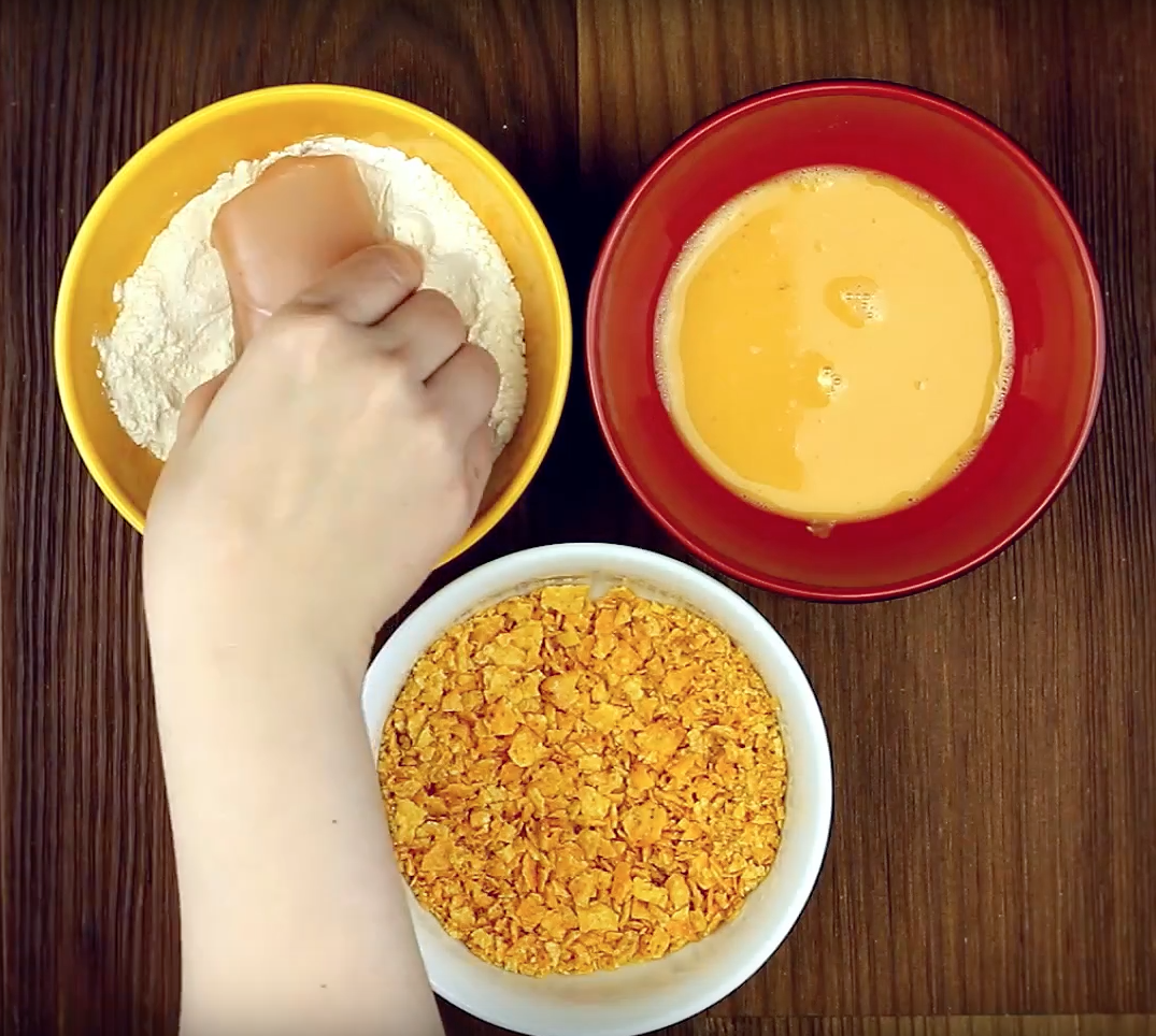 Dann wälzt du die Hühnchenrolle der Reihe nach darin. Also zuerst im Mehl, dann im Ei und abschließend in den Chips.