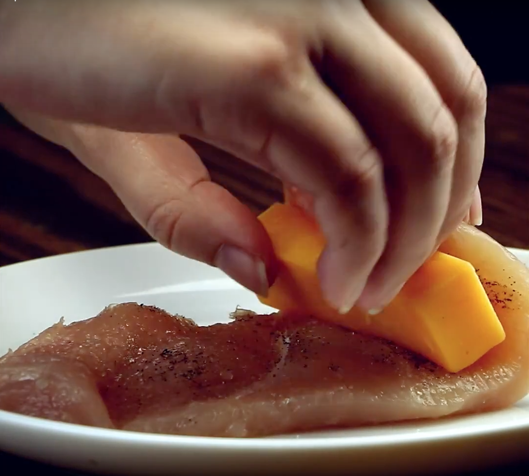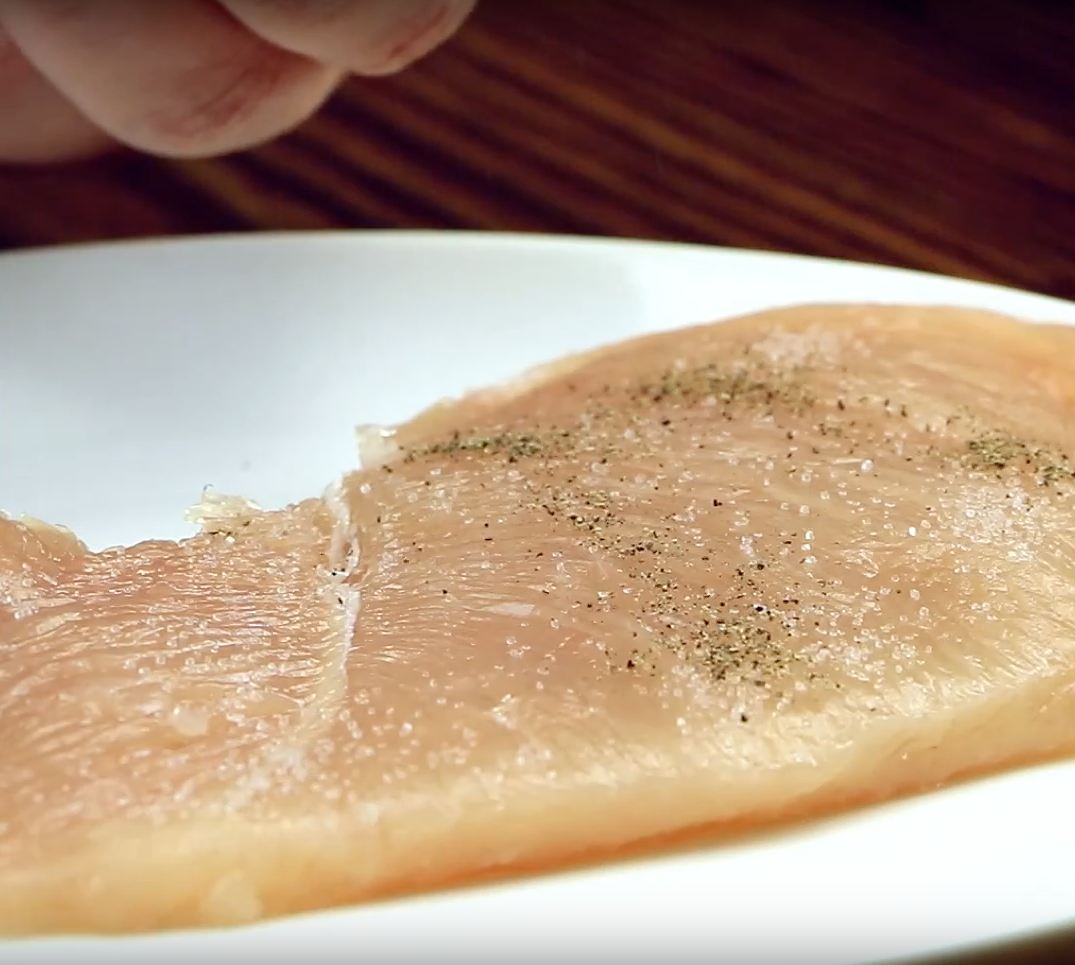 Das Hühnchenfilet einmal längs einschneiden und aufklappen, so dass eine glatte Fläche entsteht. Dann ganz klassisch mit Salz und Pfeffer würzen.