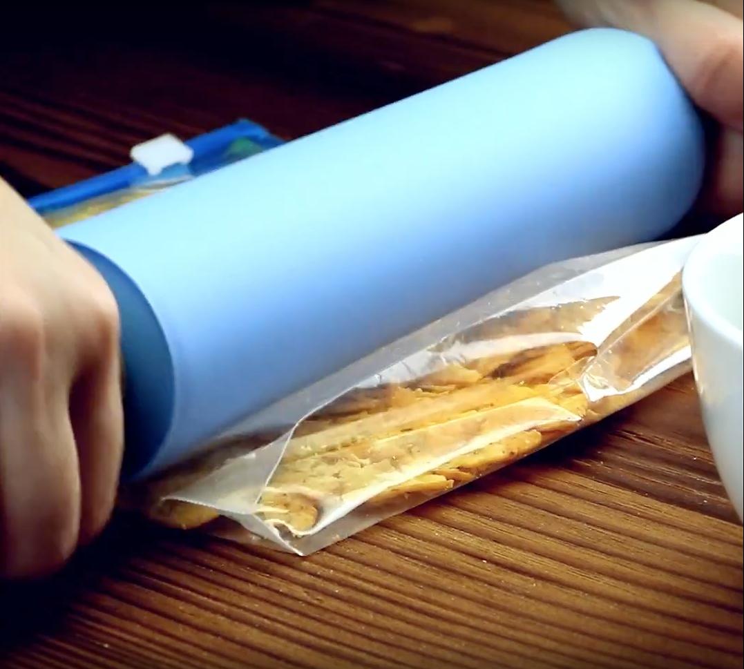Zuerst füllst du die Tortilla-Chips in einen festen Gefrierbeutel. Dann mehrfach mit dem Nudelholz darüber rollen, bis die Chips zu Krümeln werden.