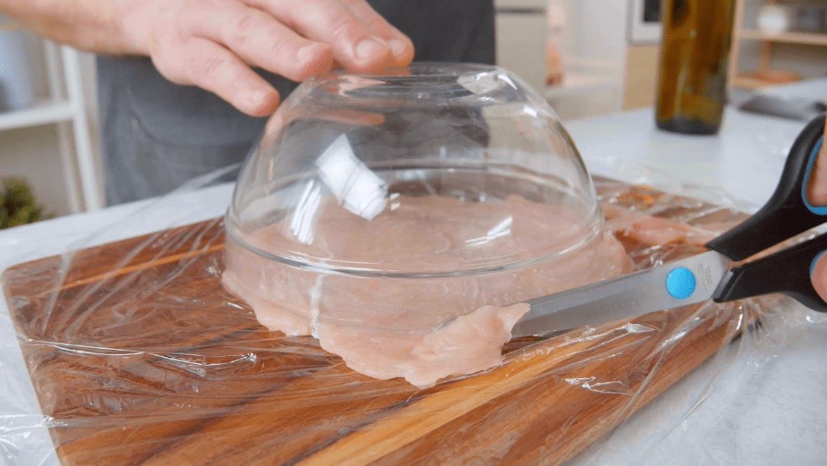 2. Entferne dann die Folie und platziere eine Schüssel umgedreht auf das Hähnchenfleisch. Schneide mit einer Schere das überlappende Fleisch ab, sodass du am Ende drei gleich große Fleisch-Kreise hast.