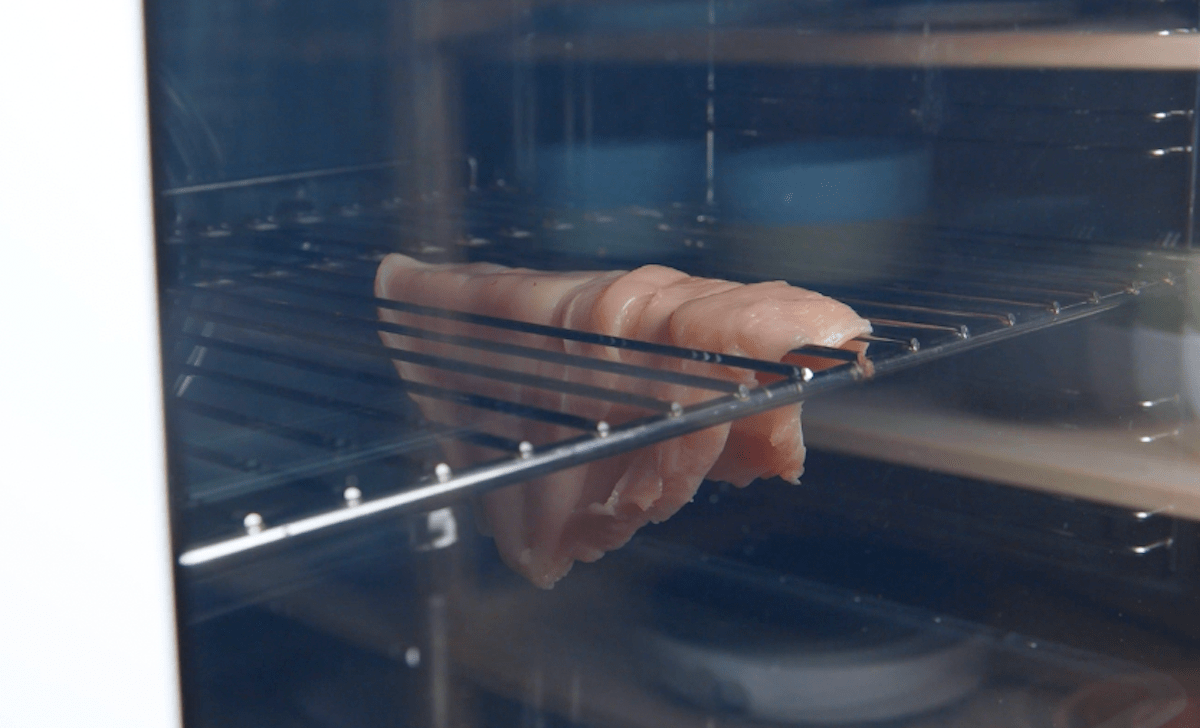 3. Hänge das Fleisch auf einen Ofenrost und lass es bei 120 °C Umluft für 20 Minuten garen. Danach muss das Fleisch ca. 15 Minuten ruhen.