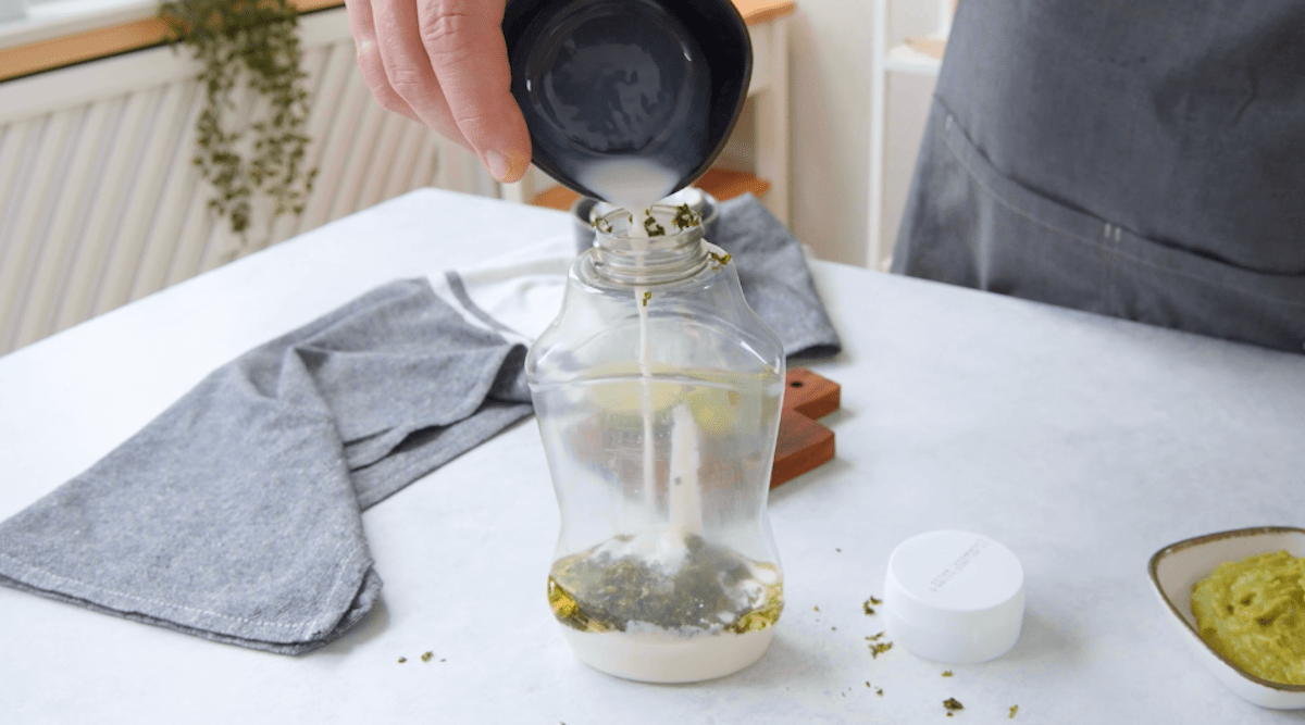 6. Fülle Joghurt, Knoblauch, Minze, Koriander, Olivenöl, Milch und Limettensaft in eine leere Ketchupflasche und schüttle diese gut.
