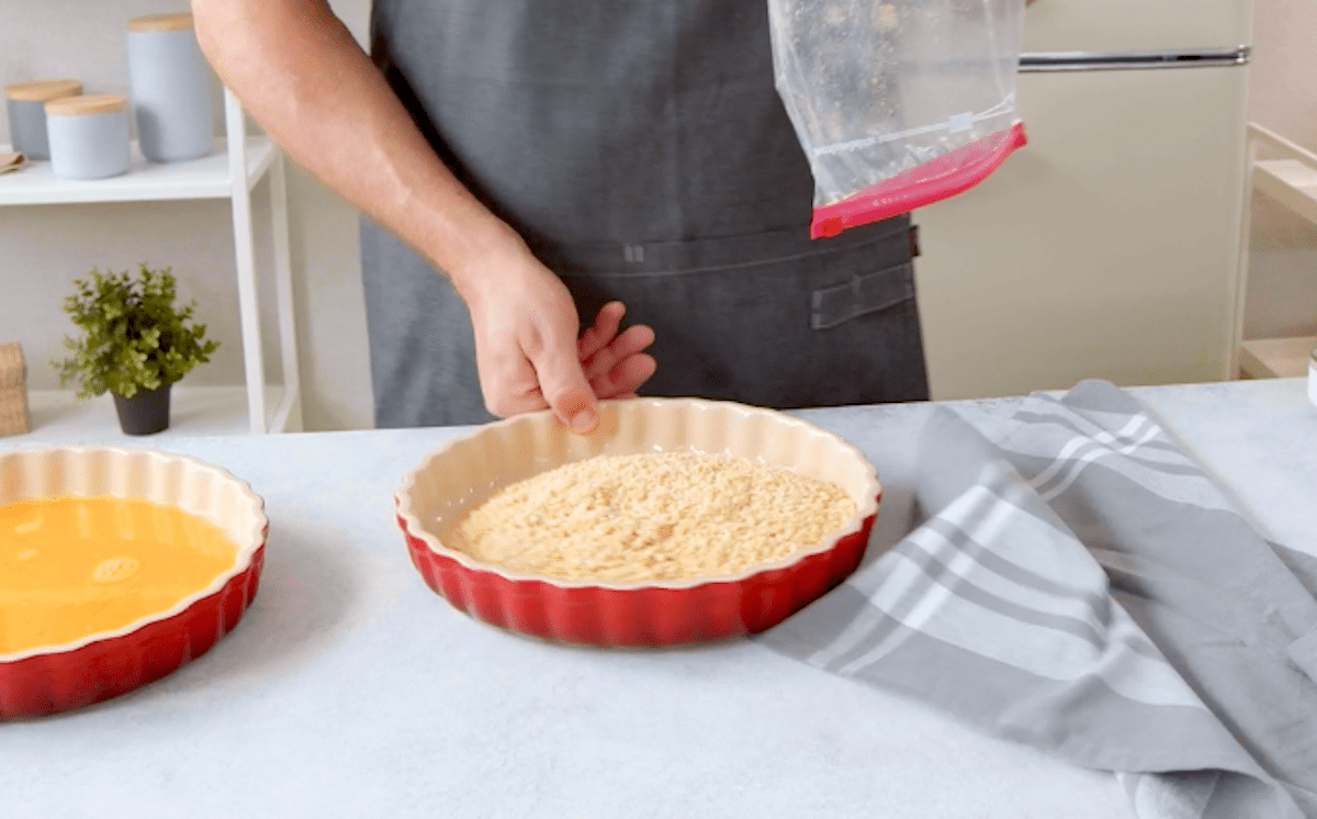 4. Gib die Gewürzmischung (Chiliflocken, Kreuzkümmel, schwarzen Pfeffer, Salz, Paprikapulver, Knoblauchpulver, Zwiebelpulver) zum Mehl hinzu und vermenge alles gut miteinander in einer Schale. Zerkleinere außerdem die Cracker und gib die Krümel in eine weitere Schale. In einer dritten Schale verquirlst du 2-3 Eier.