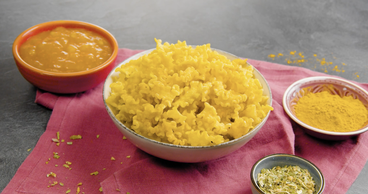 Koche die Nudeln und lass sie abtropfen. Vermische Stärke mit Currypulver und gib die Mischung über die Nudeln. Vermenge alles miteinander und frittiere es anschließend in heißem Fett. Lasse das Fett abtropfen und serviere die Curry-Pasta-Chips mit Mangochutney.