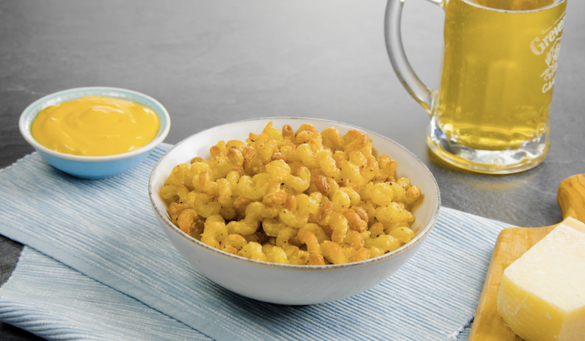 Koche die Nudeln, lass sie abtropfen und gib sie in eine Schüssel. Füge Öl, Pfeffer und geriebenen Parmesan hinzu und vermenge alles miteinander. Verteile alles auf ein mit Backpapier ausgelegtes Backblech und schiebe es bei 180 °C Umluft für 20 Minuten in den Ofen. Serviere die Mac-and-Cheese-Chips mit Käsesauce.