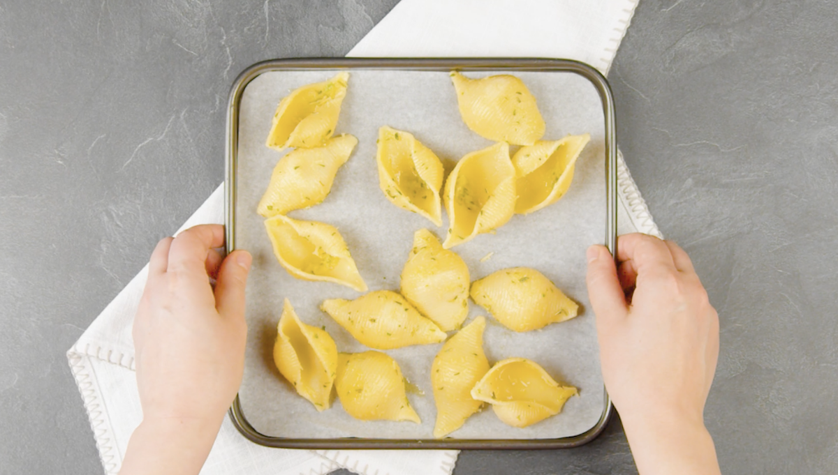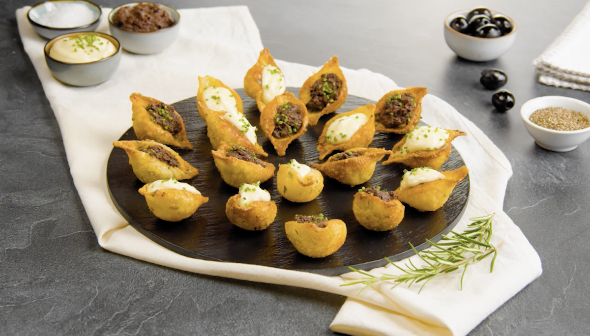 2.2 Wenn die Nudeln abgekühlt sind, fülle sie mit Aioli oder Oliventapenade. Bestreue alles noch mit Schnittlauch – und fertig ist der gefüllte Muschel-Snack.