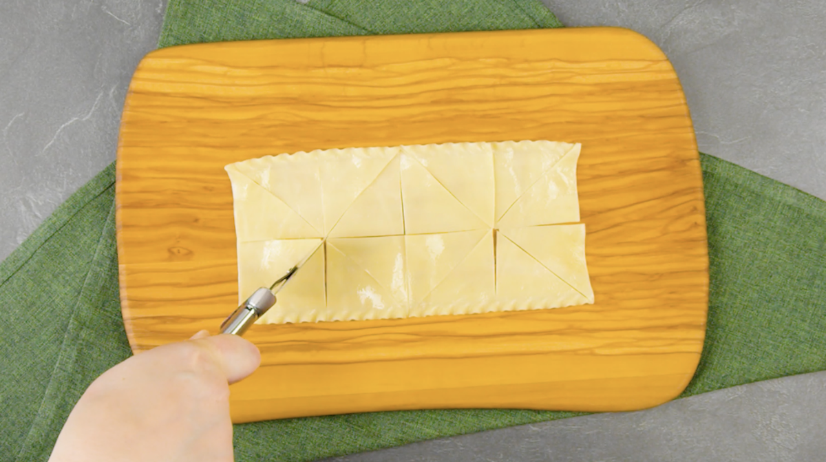 3.1 Koche die Lasagneplatten und lass sie abtropfen. Halbiere sie zuerst längs und schneide sie dann diagonal durch, sodass kleine Dreiecke entstehen.