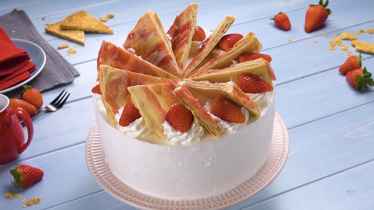 Egal, ob am Stiel, in der Waffel oder aus dem Becher – Eis erfreut sich weltweit in diversen Geschmacksrichtungen großer Beliebtheit. Doch auch in Tortenform schmeckt die gefrorene Nascherei einfach nur himmlisch, vor allem in Kombination mit knusprigem Blätterteig und frischen Erdbeeren.