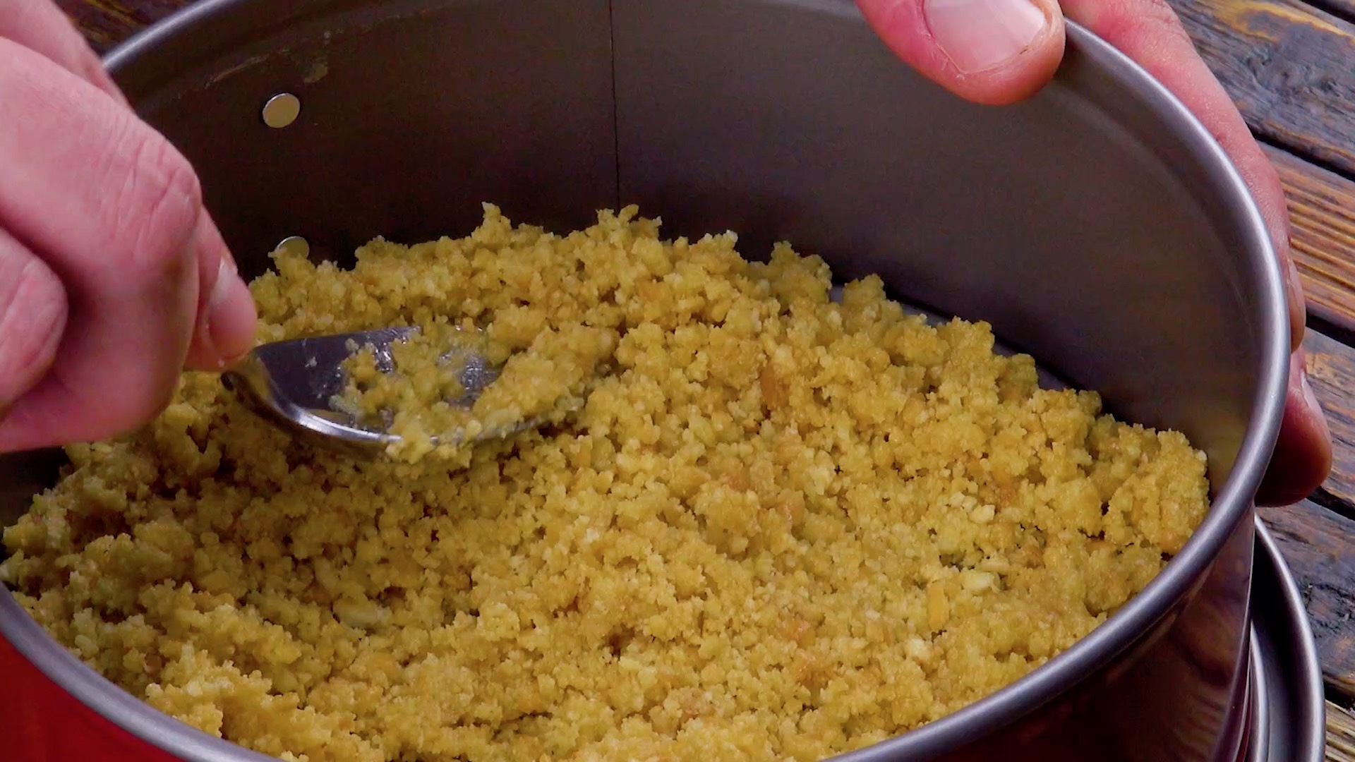 1.) Bereite zunächst den Boden zu, indem du die Kekse in einen Gefrierbeutel legst und mit einem Nudelholz fein zerbröselst. Verrühre die Krümel in einer Schüssel mit der Butter und bedecke mit dem Teig anschließend den Boden einer Kuchenform. Stelle die Kuchenform mit dem Teigboden in den Kühlschrank.
